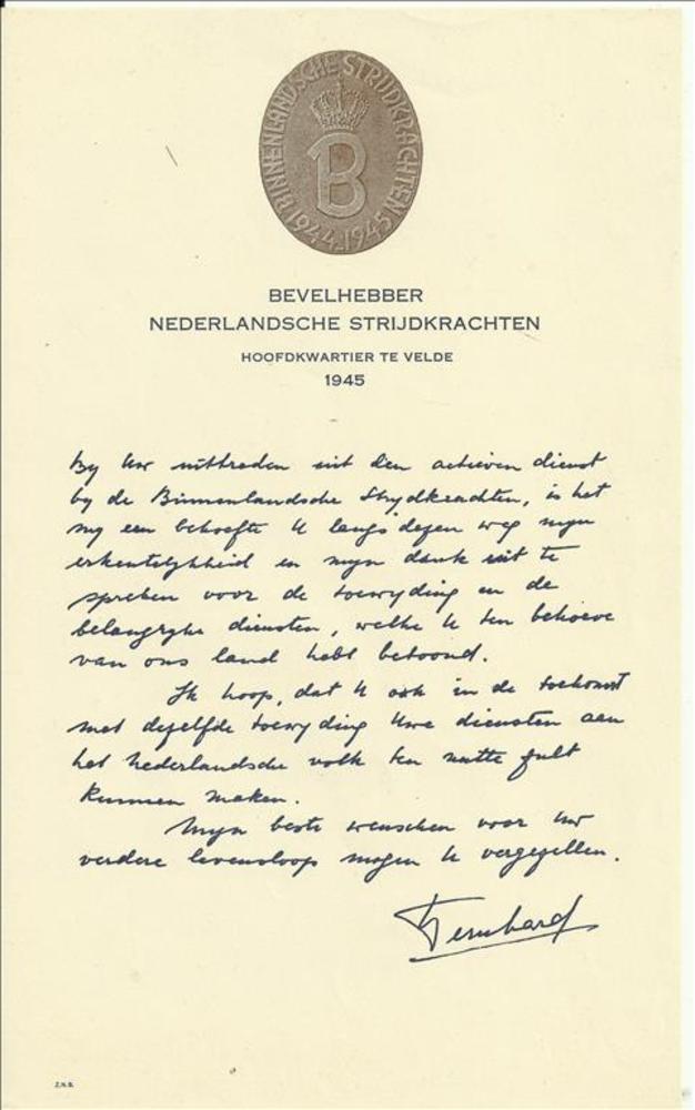 Dankbrief Prins Bernhard aan Johannes van den Bent
