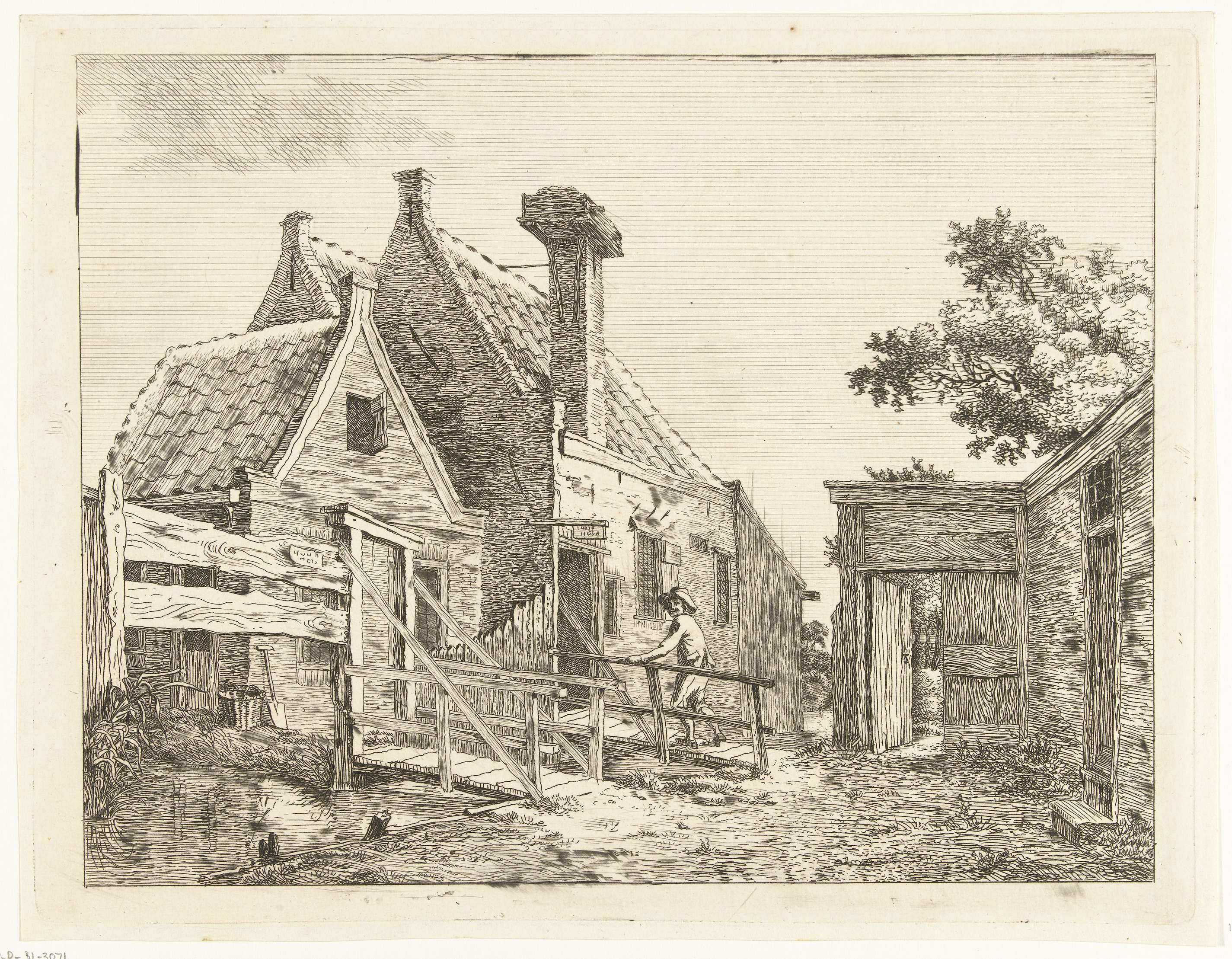 Melkmeisje bij de poort van een boerderij