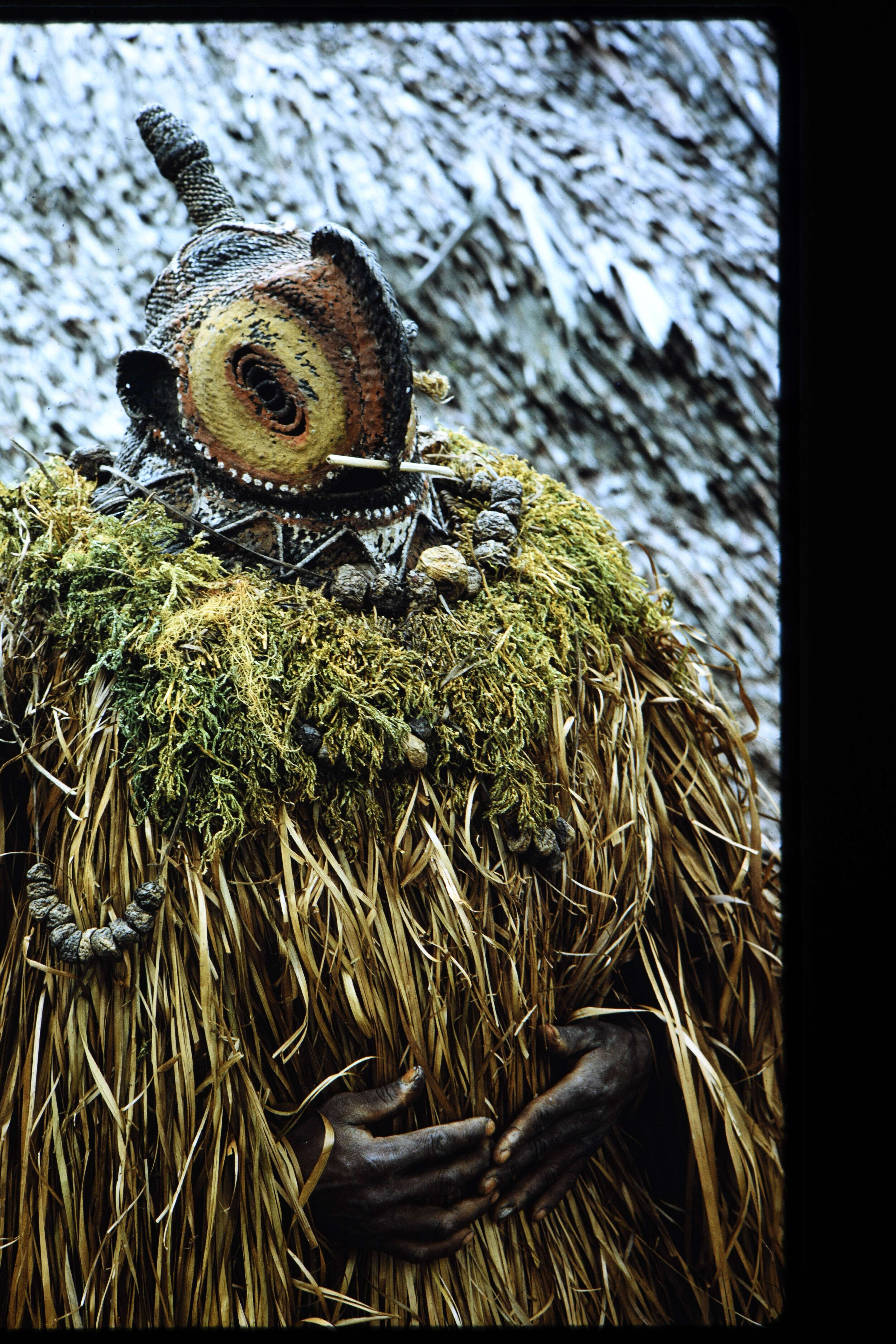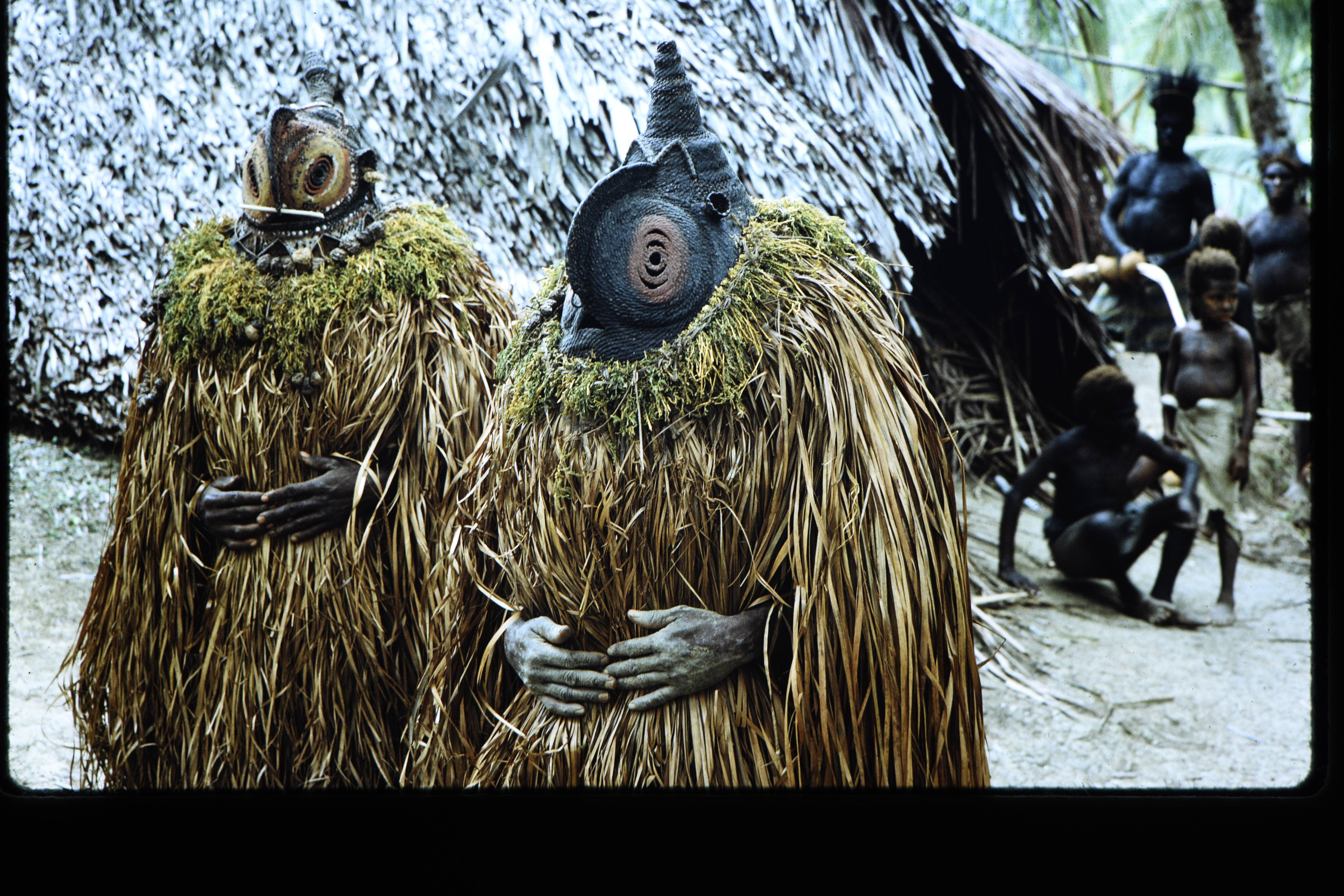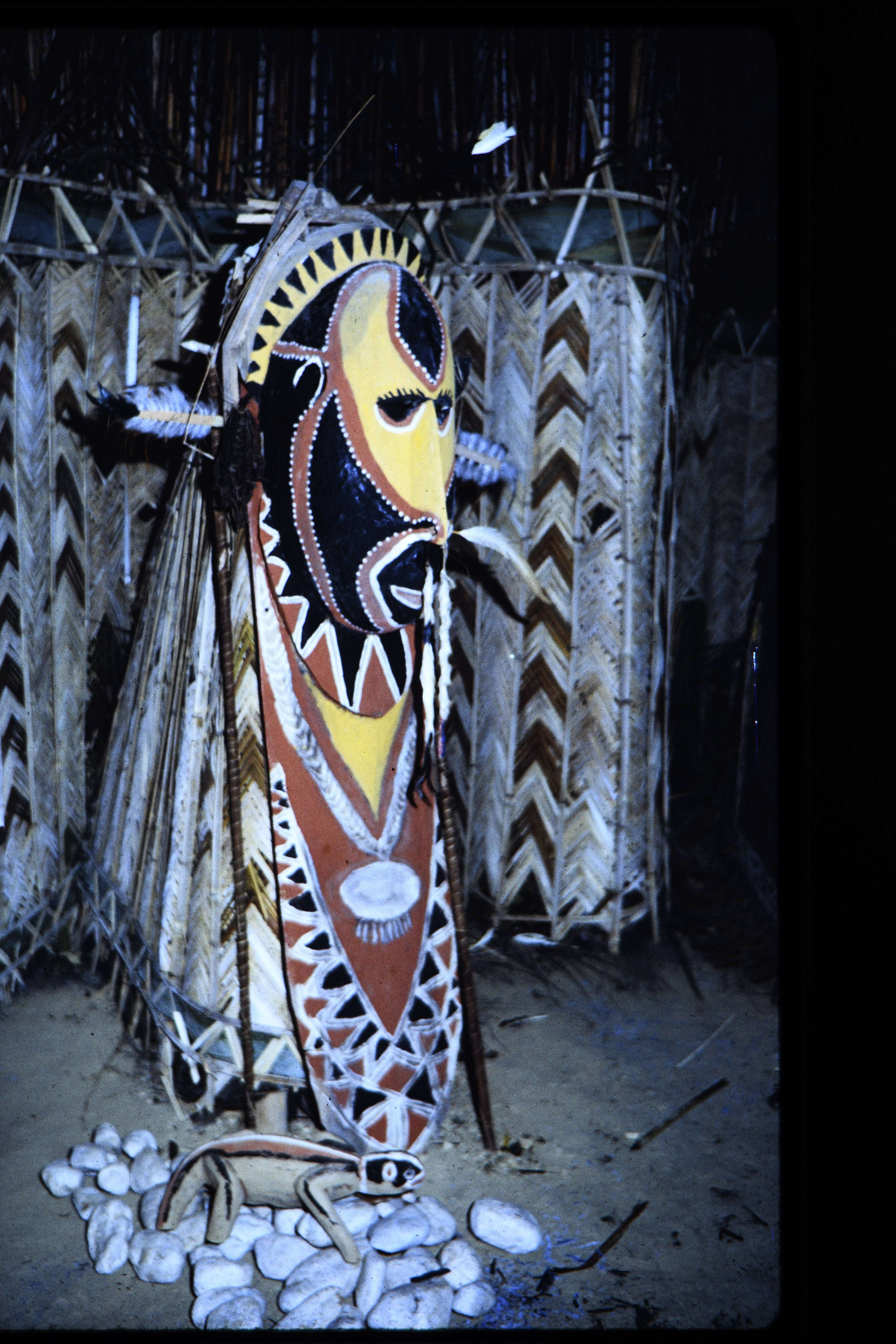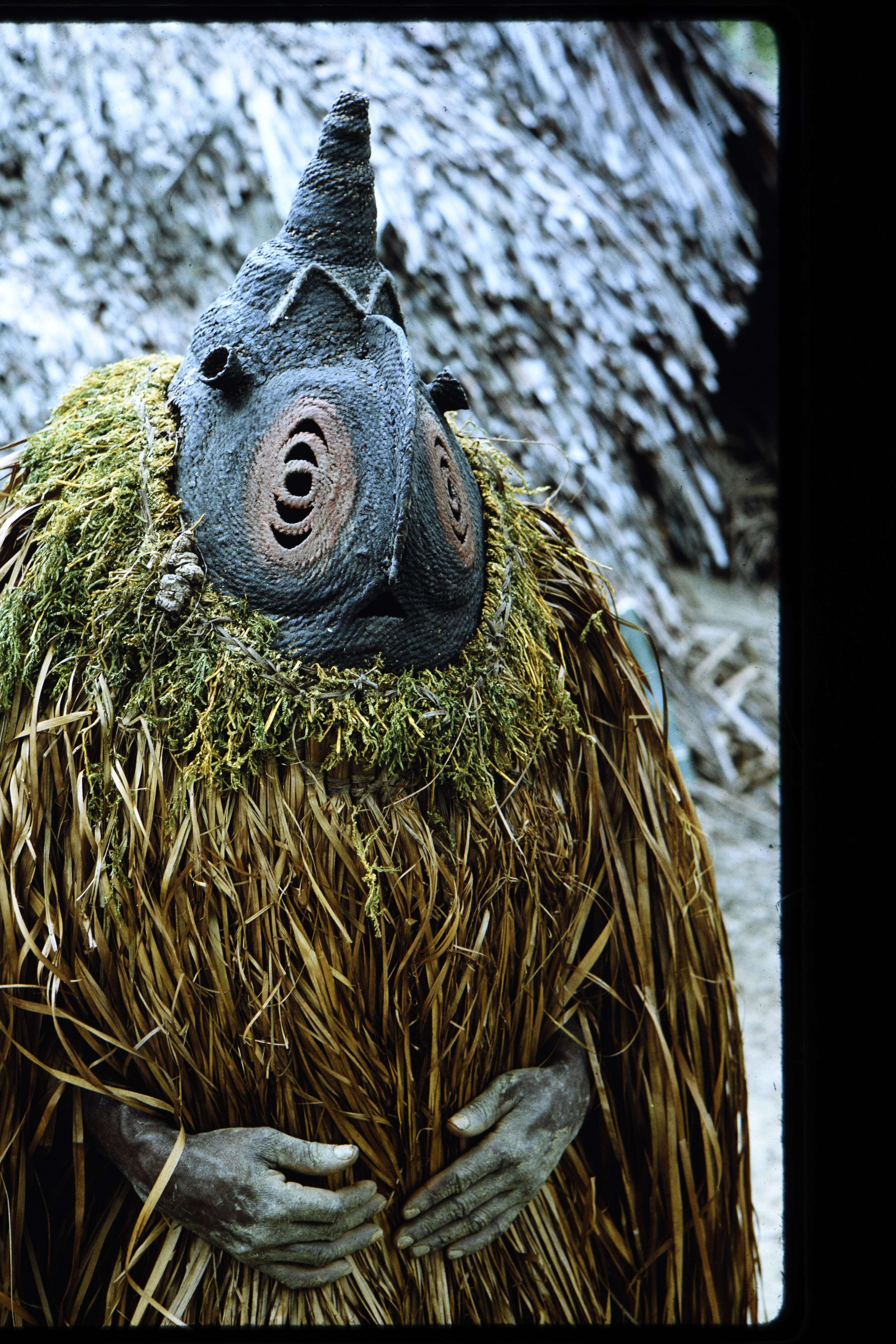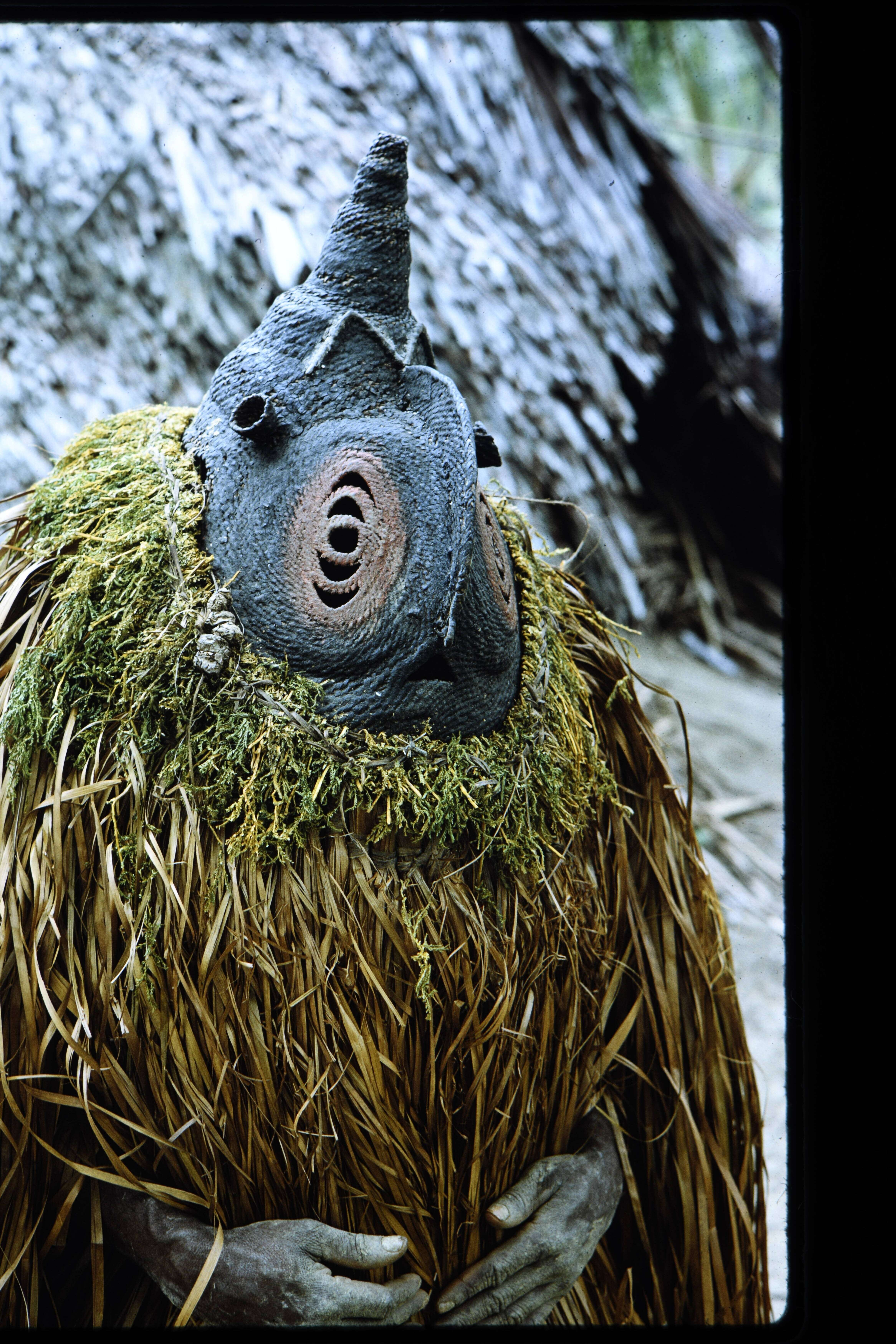 Opnamen van 2 gevlochten Wosera maskers met tooi, va...