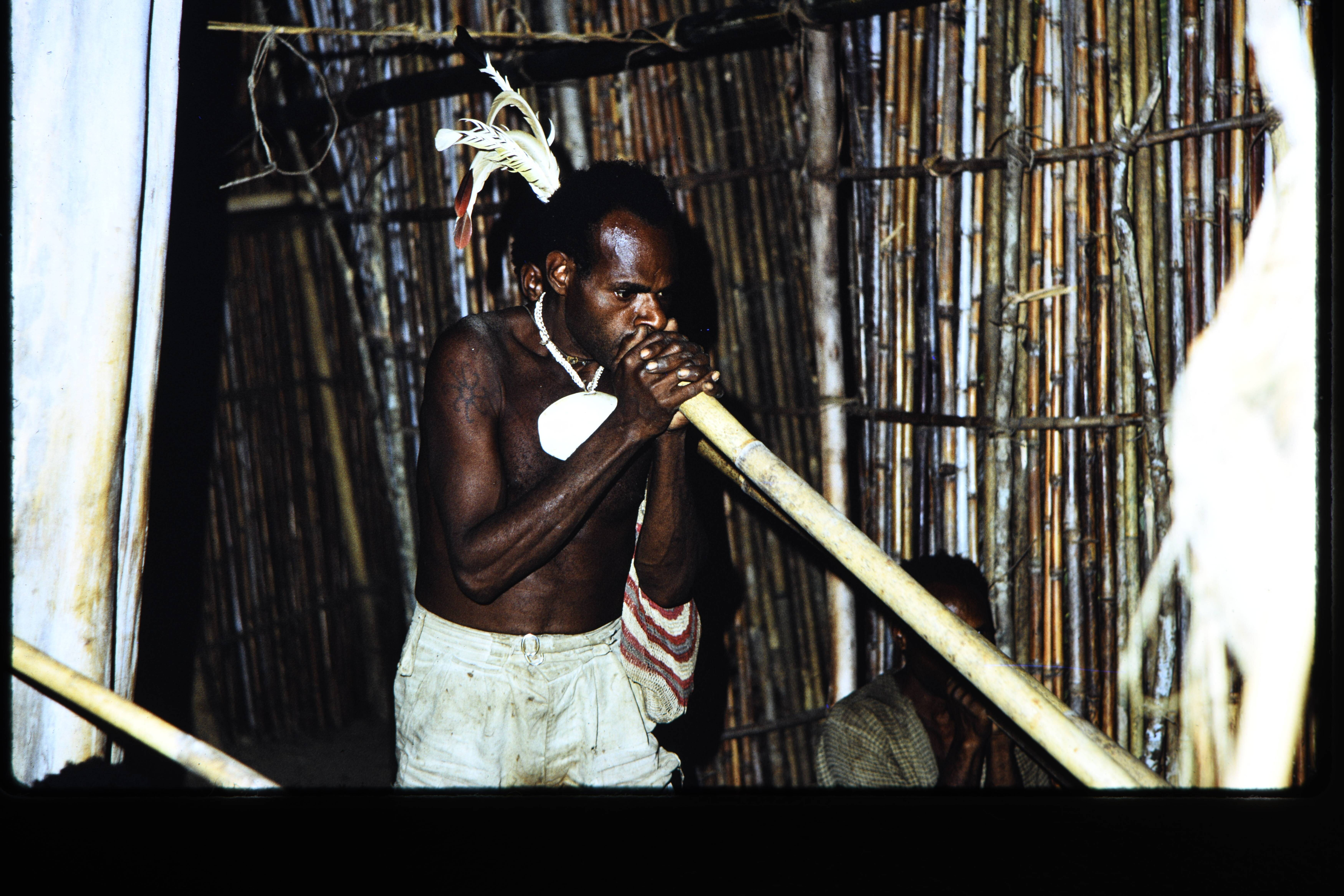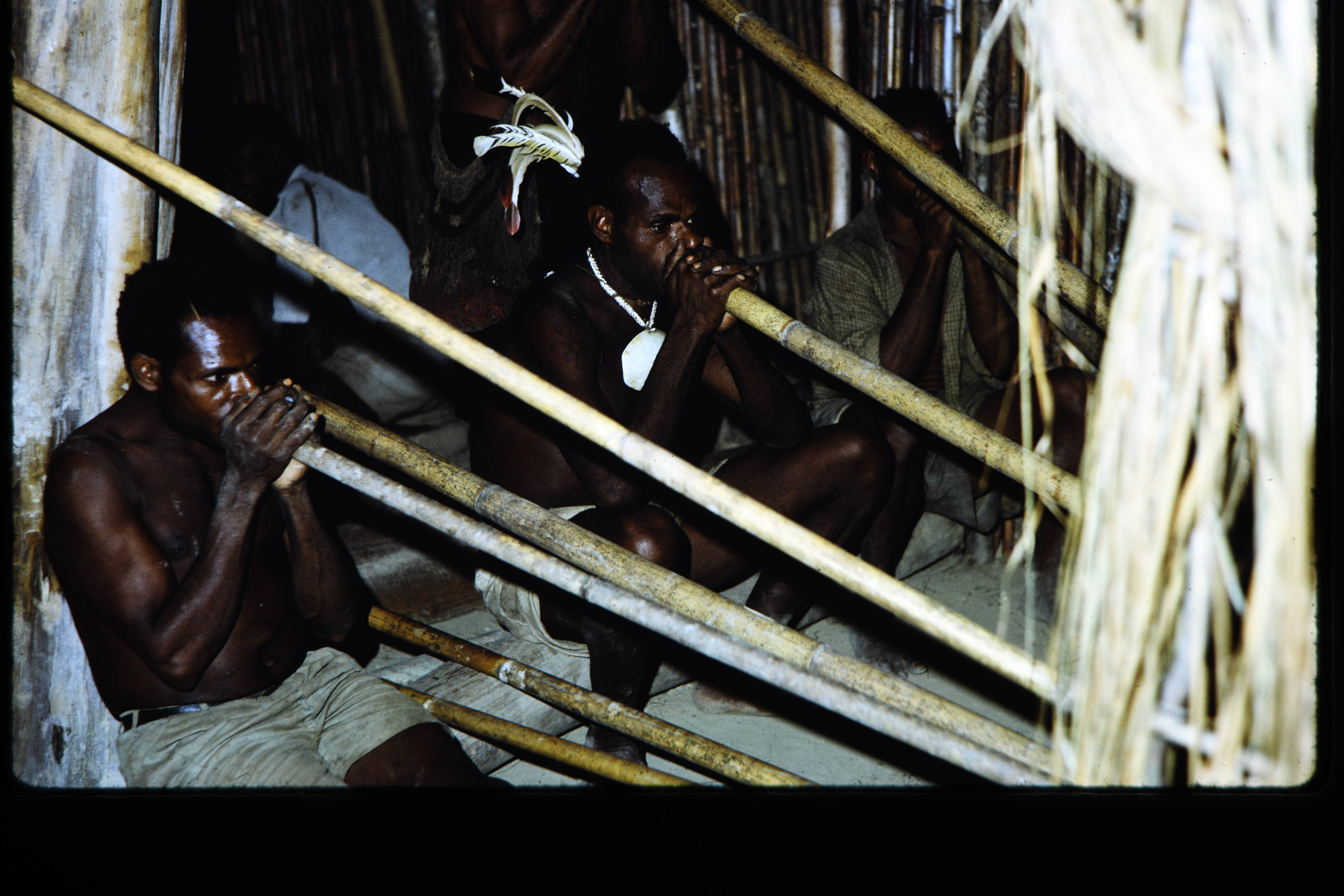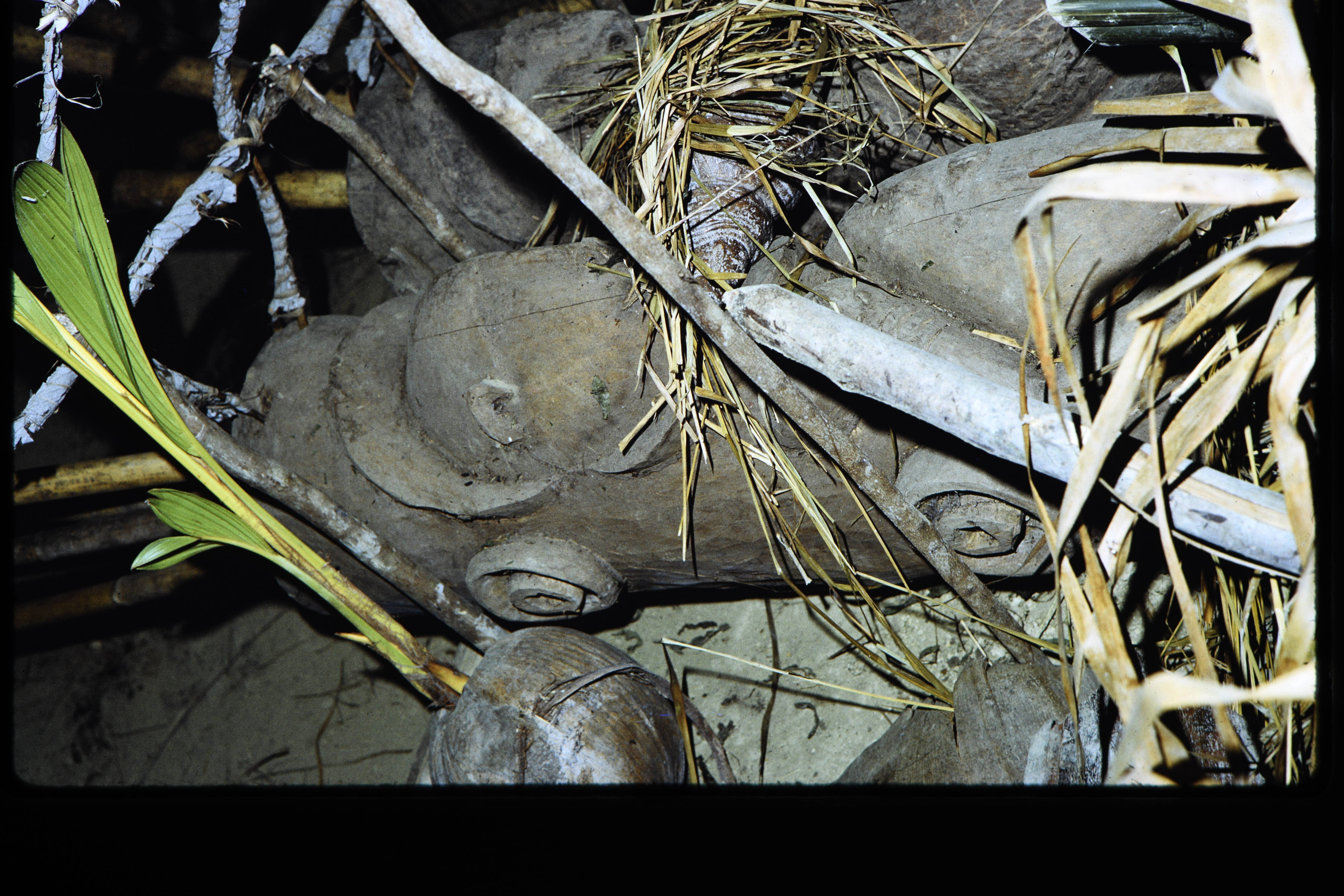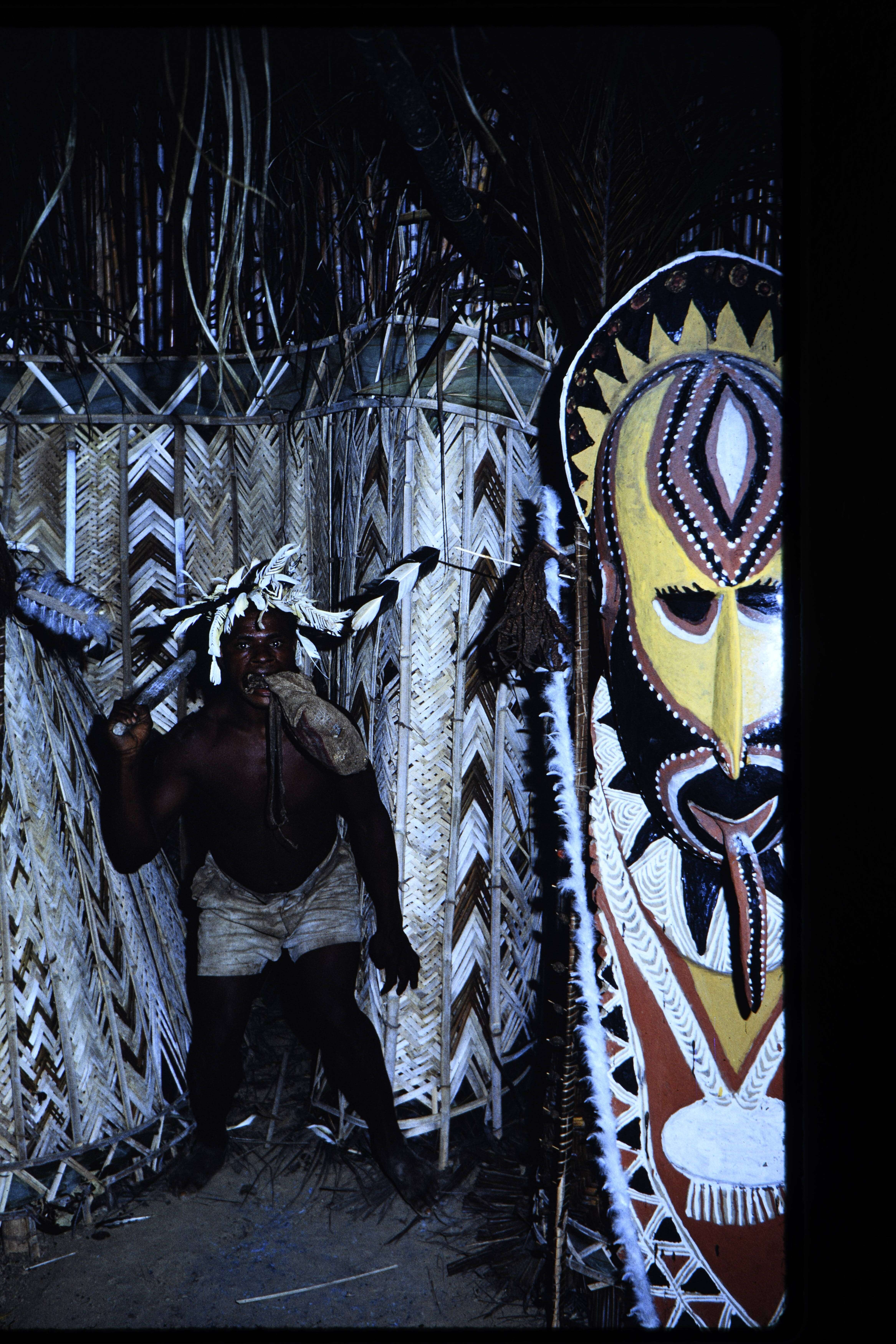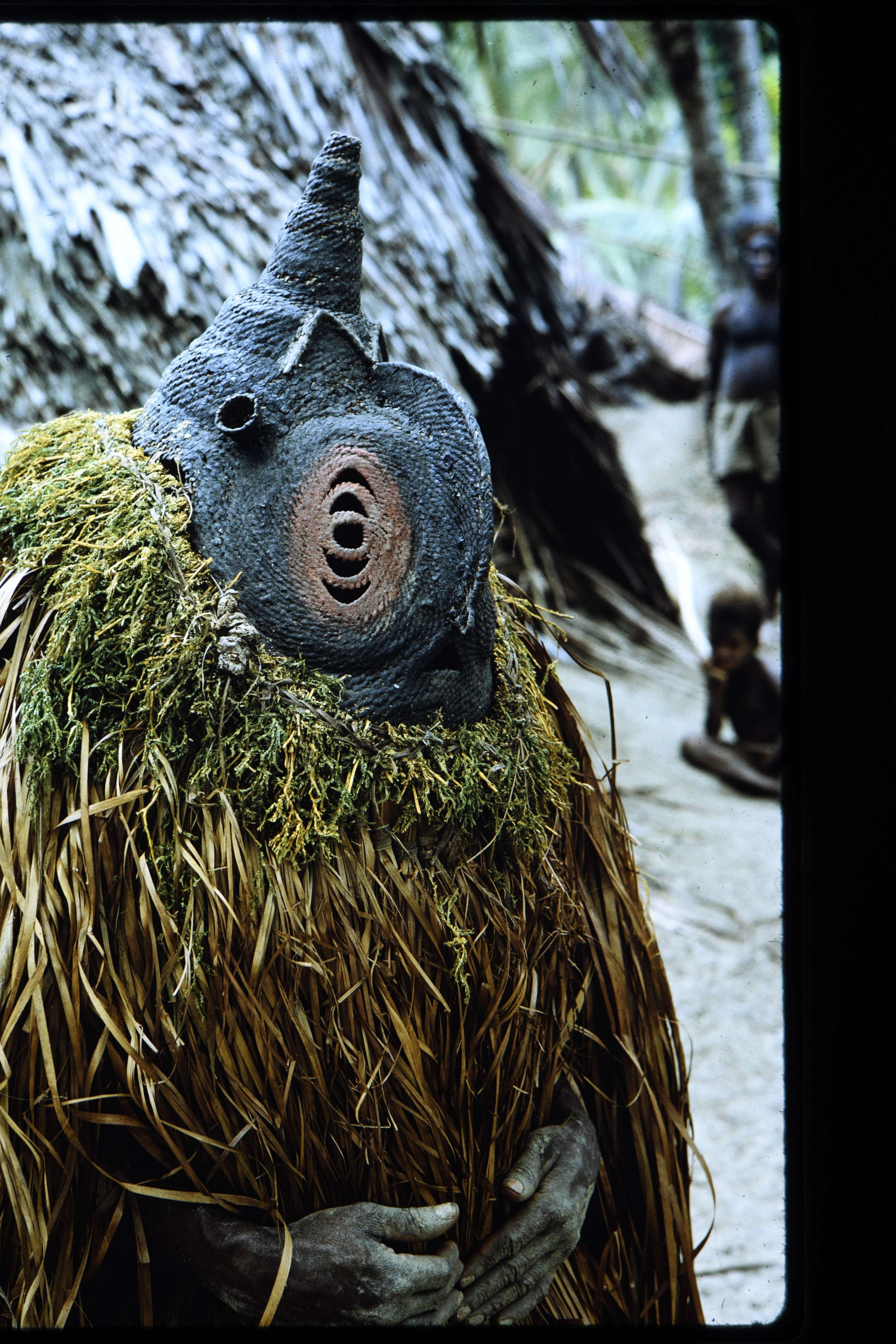 Opnamen van 2 gevlochten Wosera maskers met tooi, va...