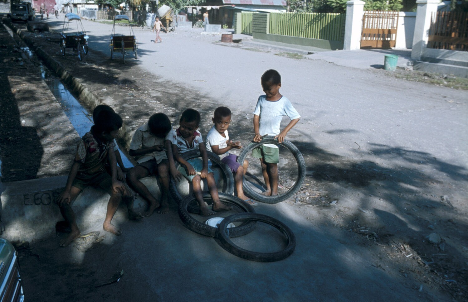 Spelende kinderen met banden als hoepels in Ujung Pa...