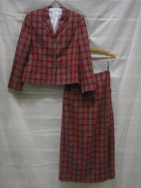 Mantelpak van rode wol met ingeweven ruiten in groen...