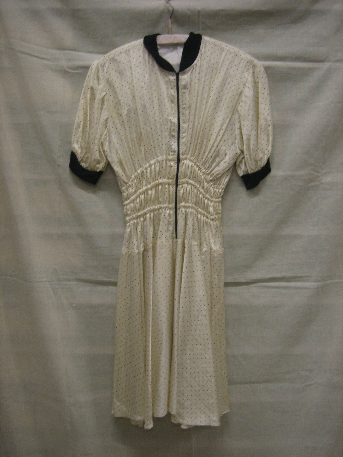 Jurk van crèmekleurig satijn met zwarte stippen, kni...