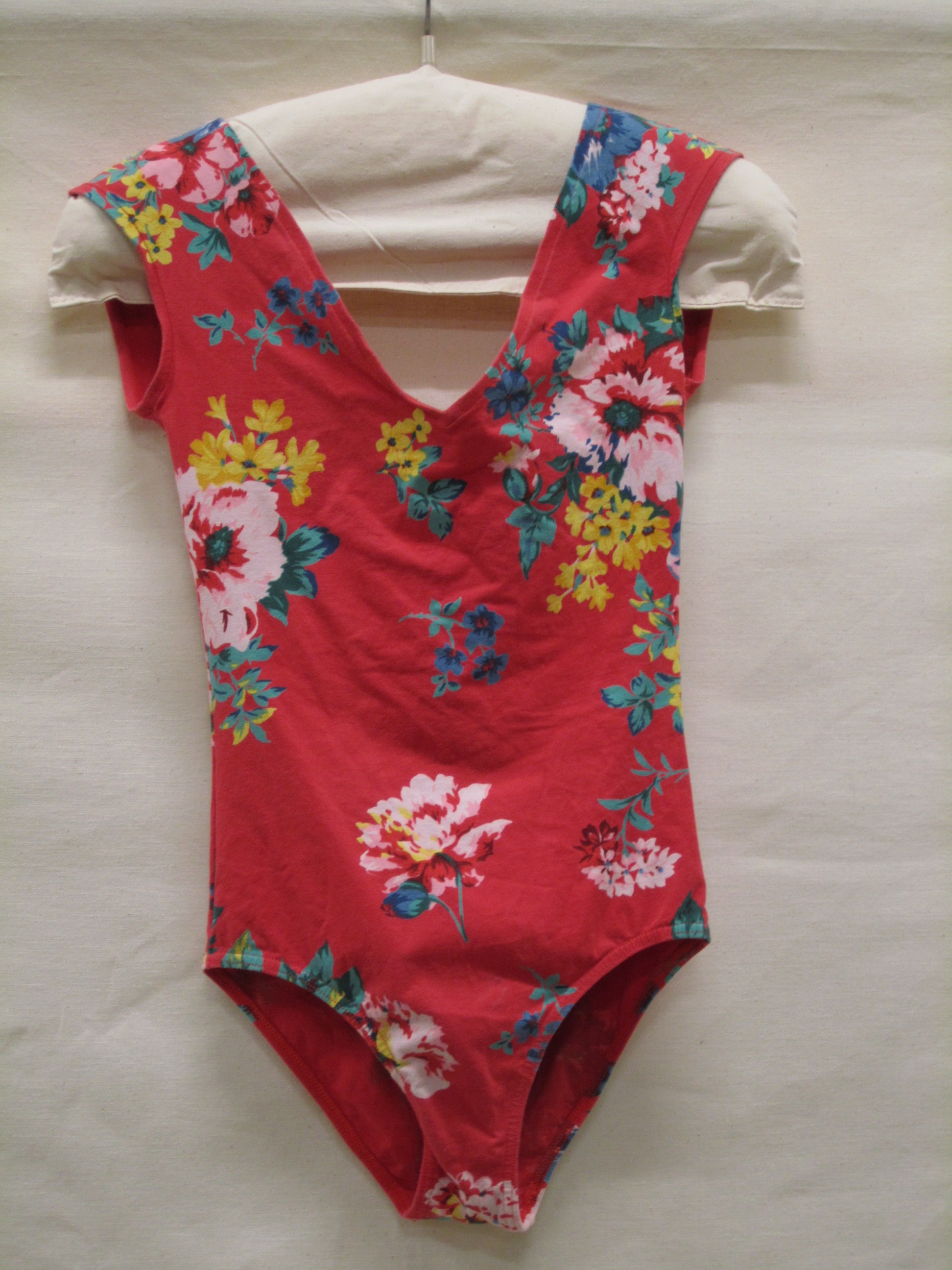 Badpak van rood tricot bedrukt met gekleurd bloemmotief