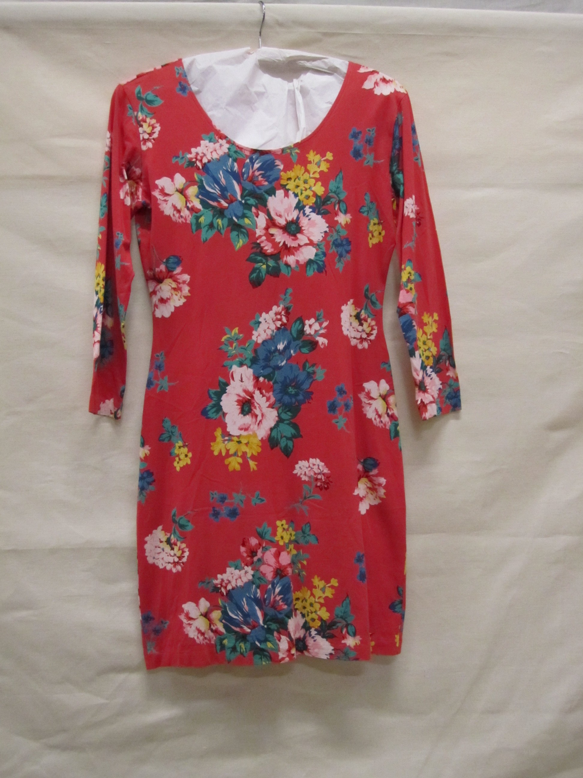 Jurk van rode tricot bedrukt met gekleurd bloemmotief