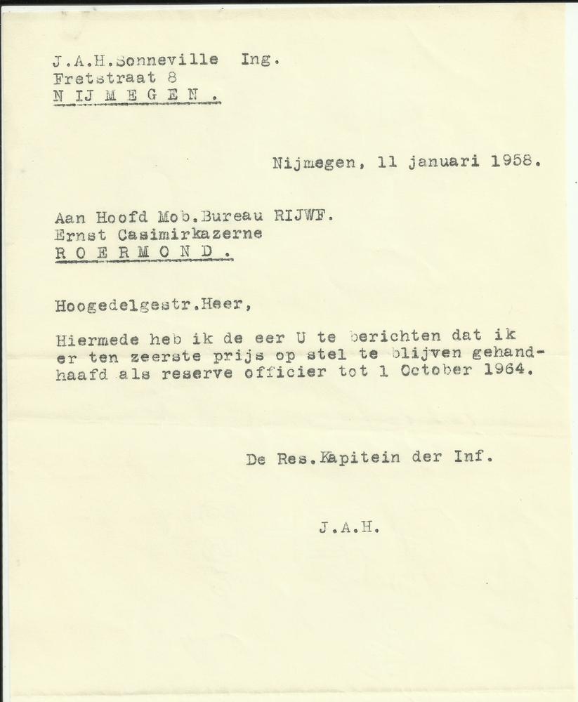 Bericht handhaving als reserve officier 11 januari 1958