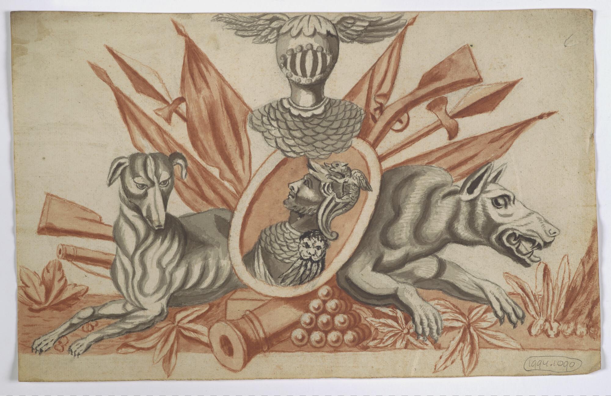 Tekening van een versiering met hond, wolf, kanon, t...