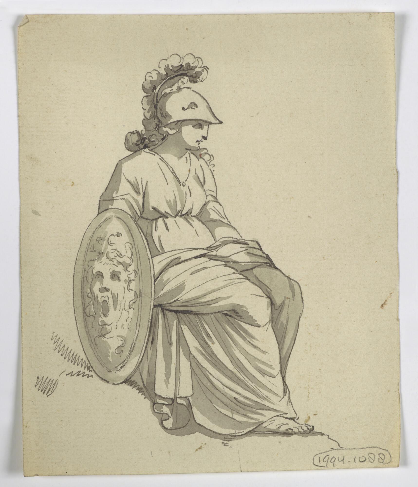 Tekening van een zittende vrouwenfiguur met helm