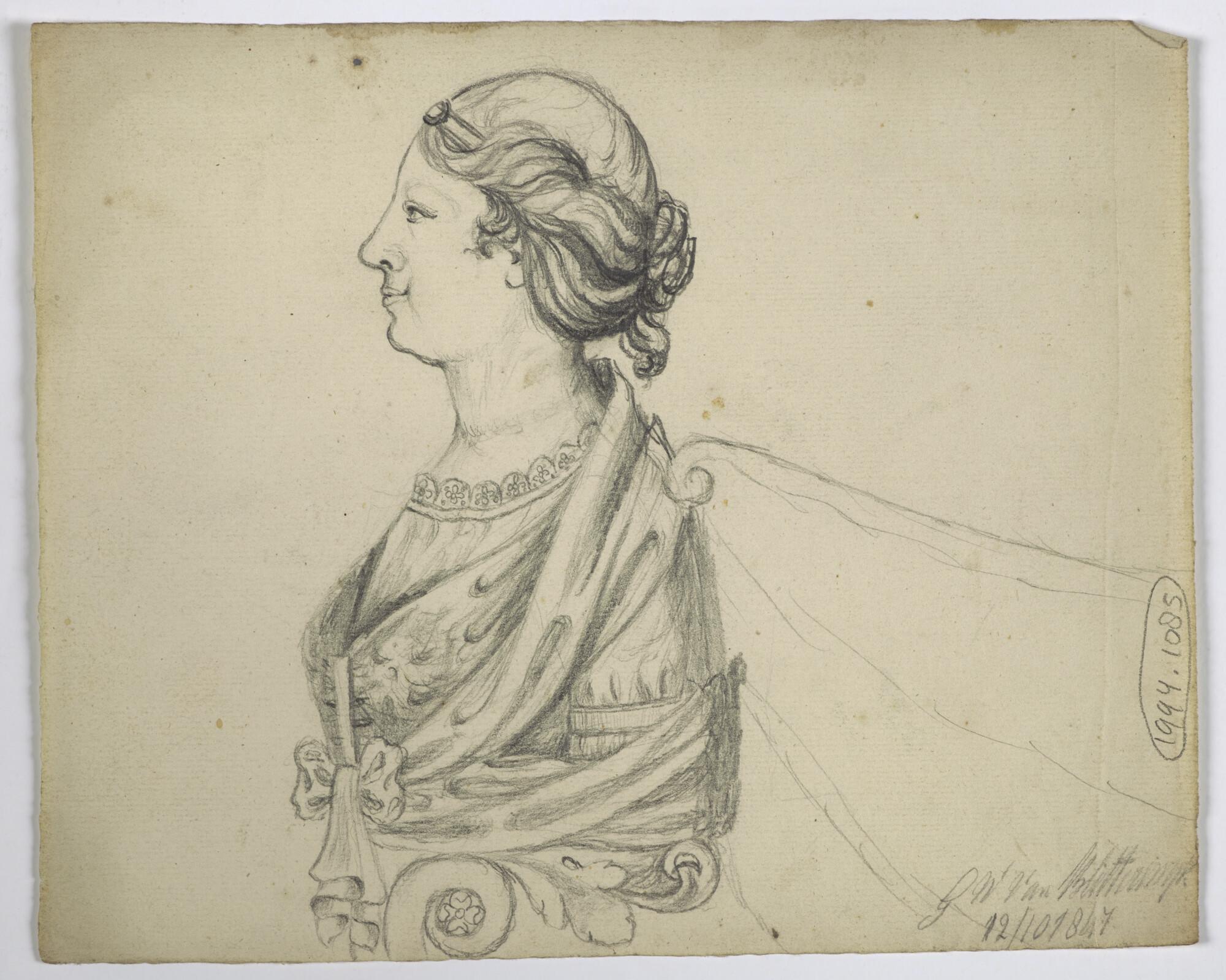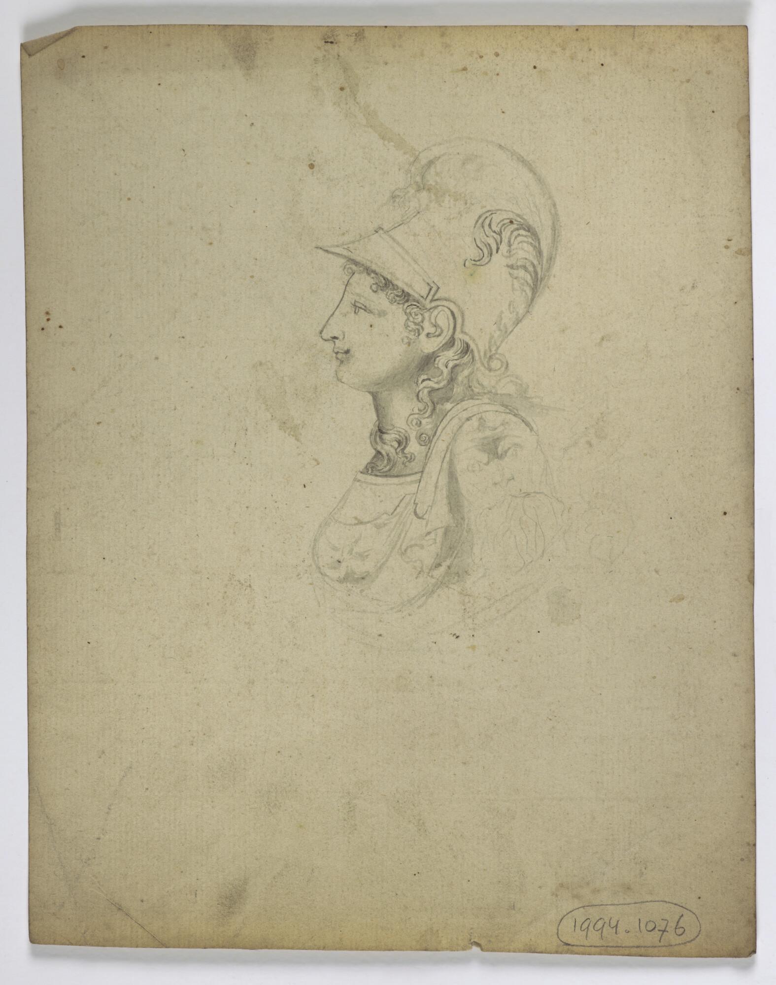 Tekening van borstbeeld van gehelmde vrouw