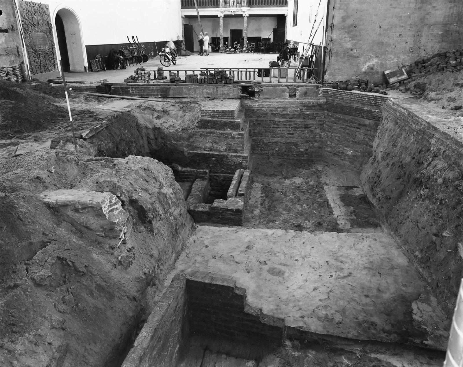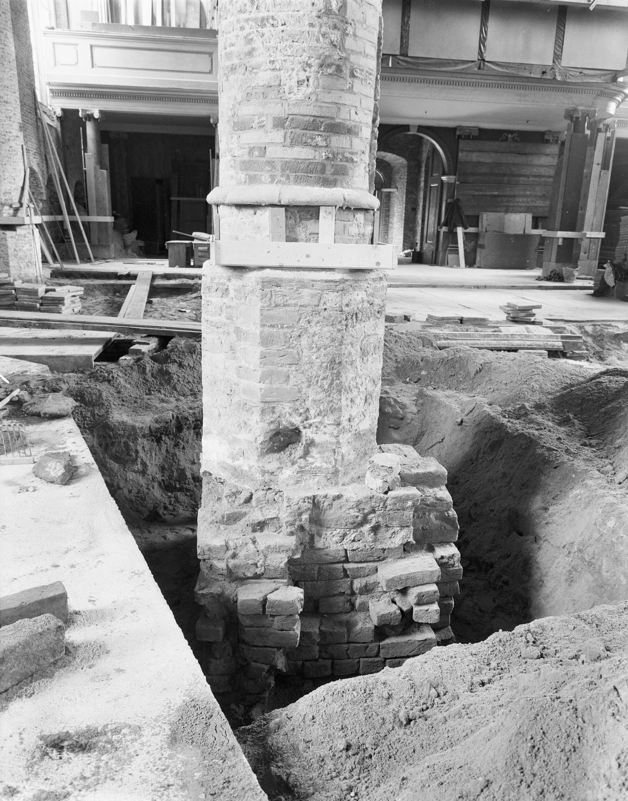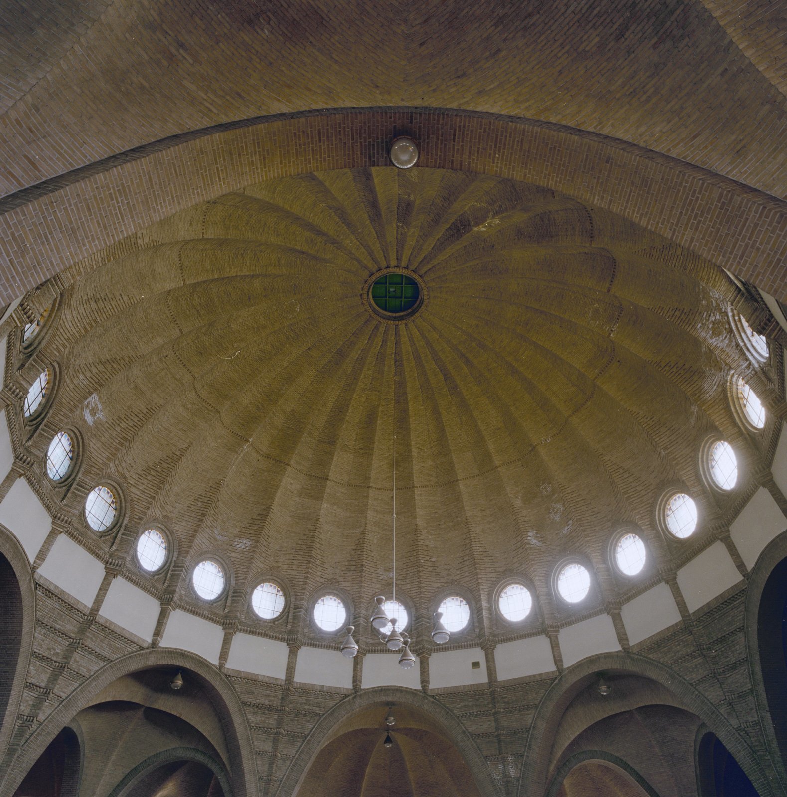 Interieur, bakstenen schermkoepel op ring van gewape...