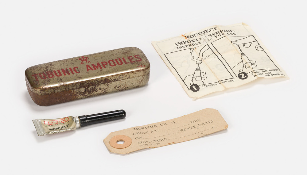 Metalen blikje voor morfineampullen gebruikt in EHBO...