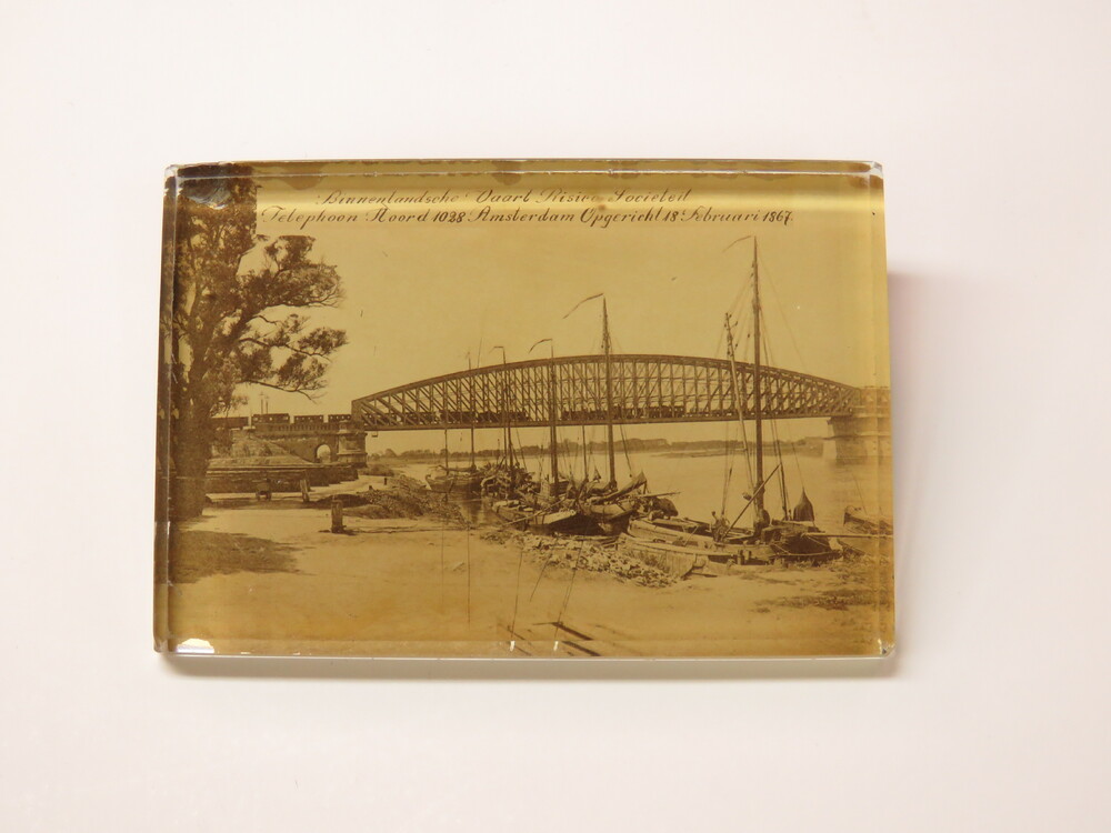 pressepapier van glas uit 1868, met foto van spoorbr...