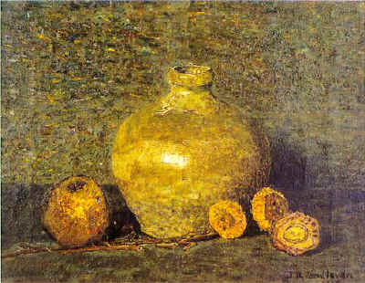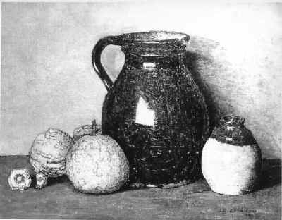 Stilleven met bruine kan, bruin en wit kruikje en si...