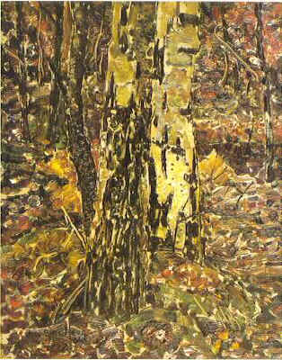 Bosgezicht met twee berkestammen op de voorgrond