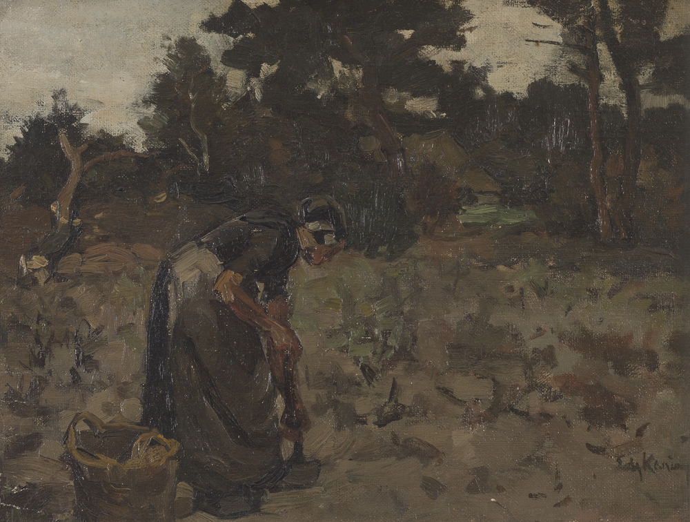 Boerin in streekdracht aan het werk op de akker [toe...