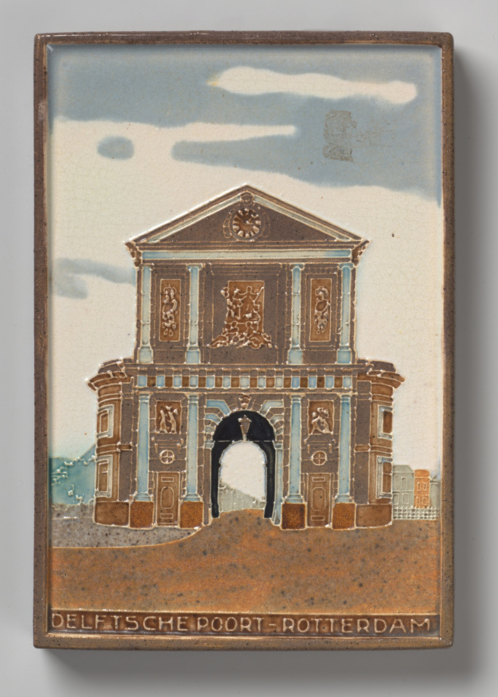Tegel in cloisonné-techniek, met voorstelling: Delft...