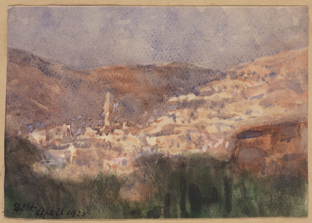 Spitse torens in heuvellandschap, Ain Karim