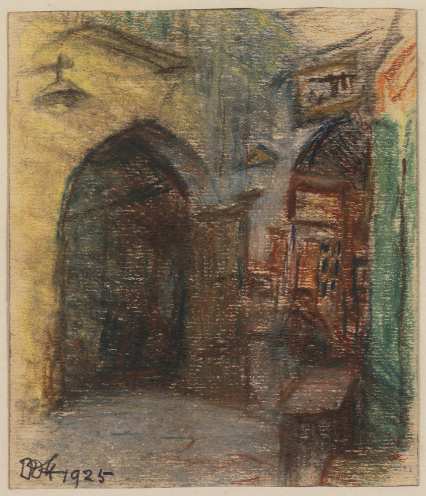 Gezicht op de hoek van een pleintje met twee bogen, ...