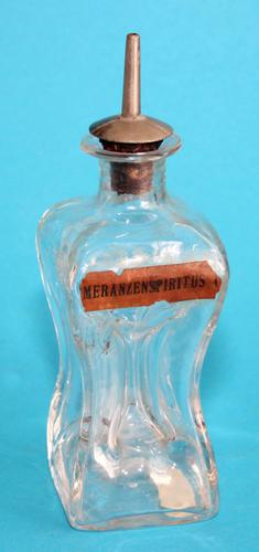Glazen karafje met sticker: ‘Meranzenspiritus’.