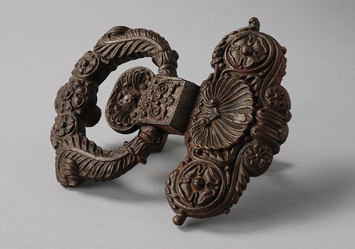 Gedecoreerde ijzeren deurklopper, in de vorm van vro...