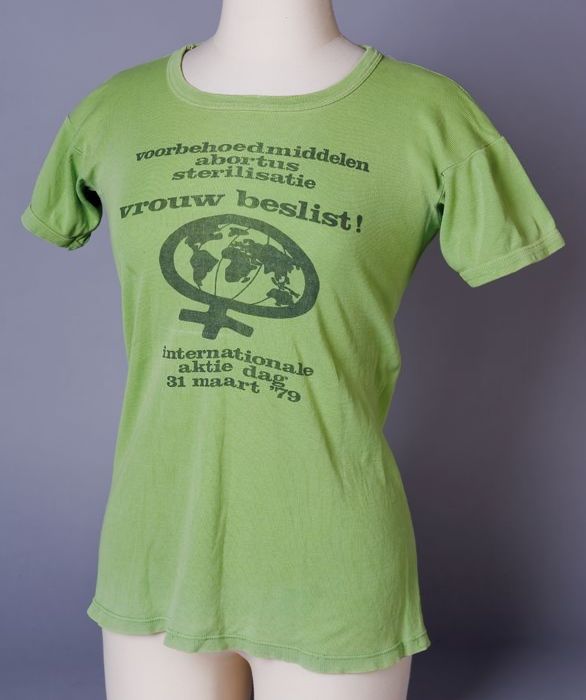 T-shirt van groen katoen met "voorbehoedsmiddelen ab...
