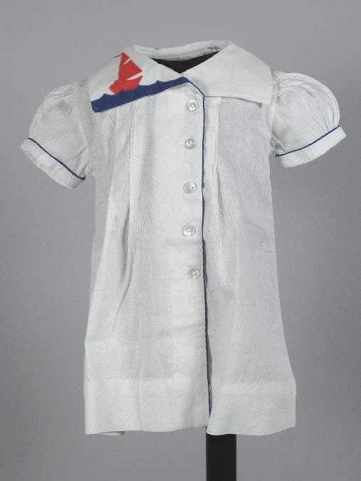 Wit katoenen kinderjurkje met rood zeilbootje op kraag