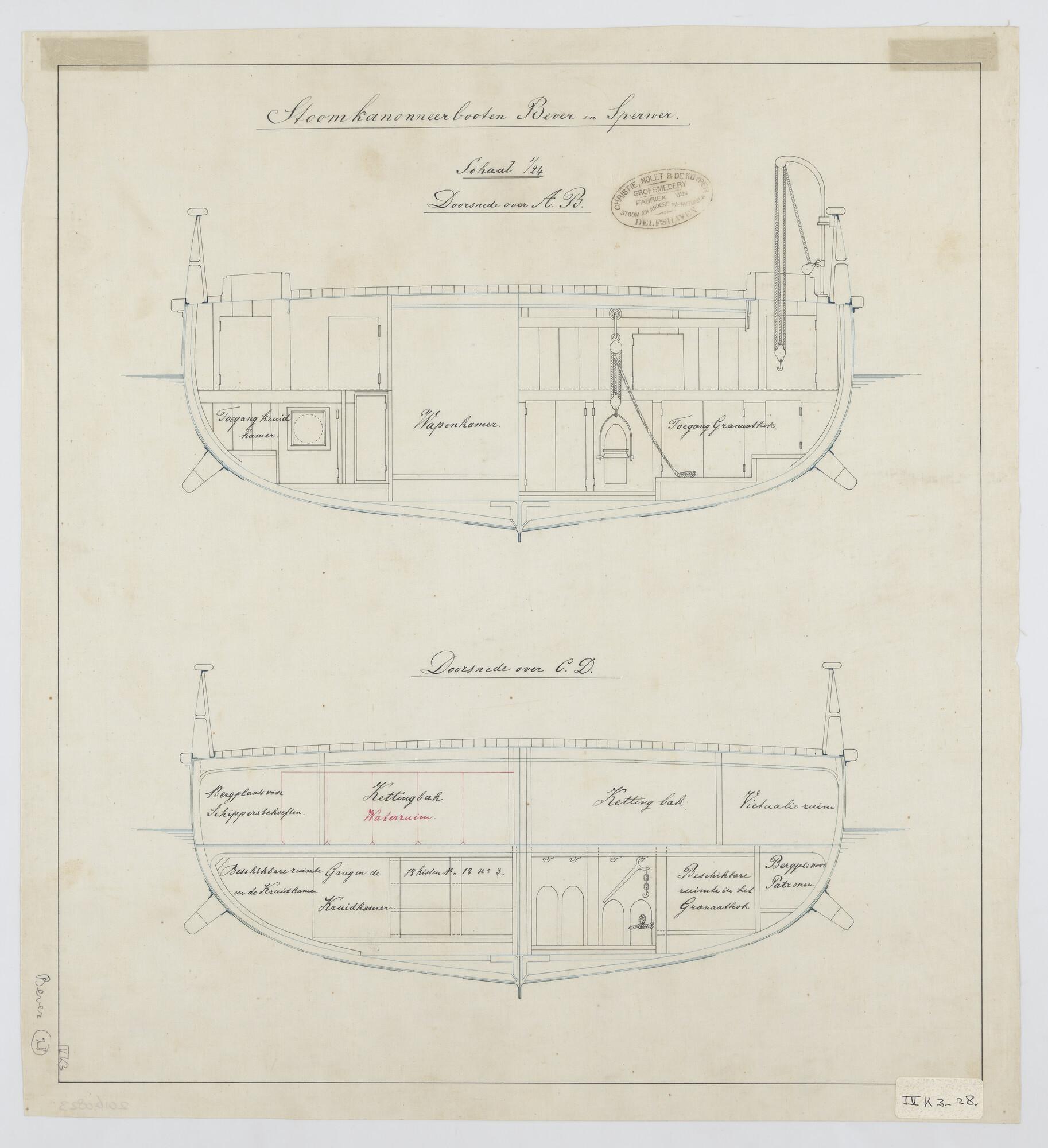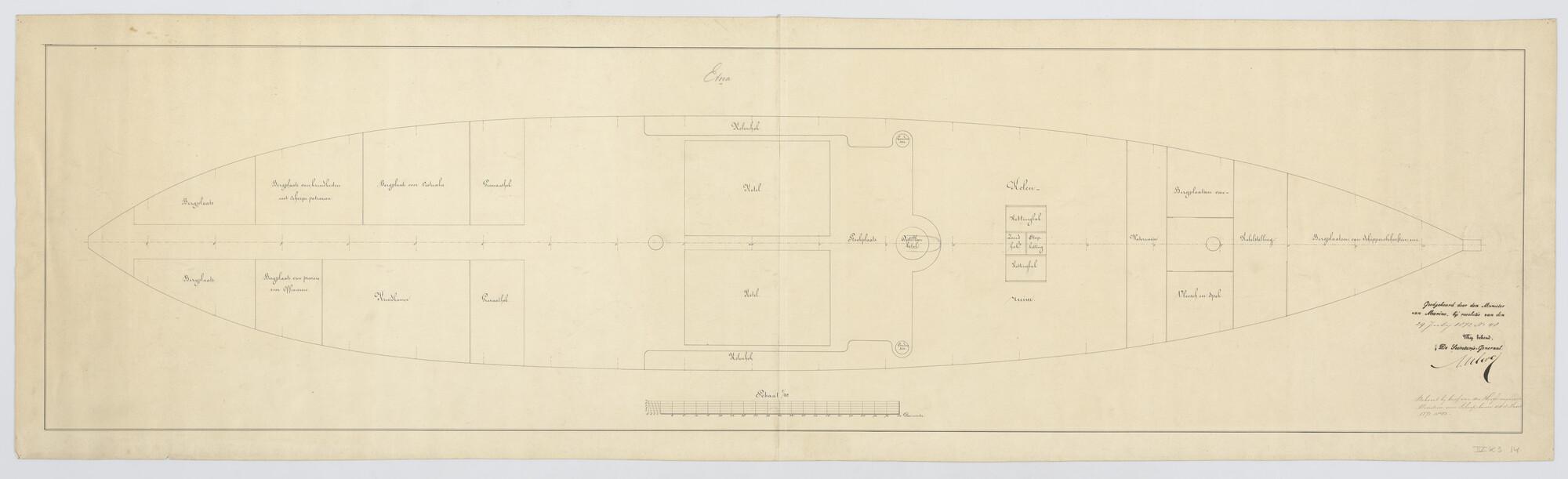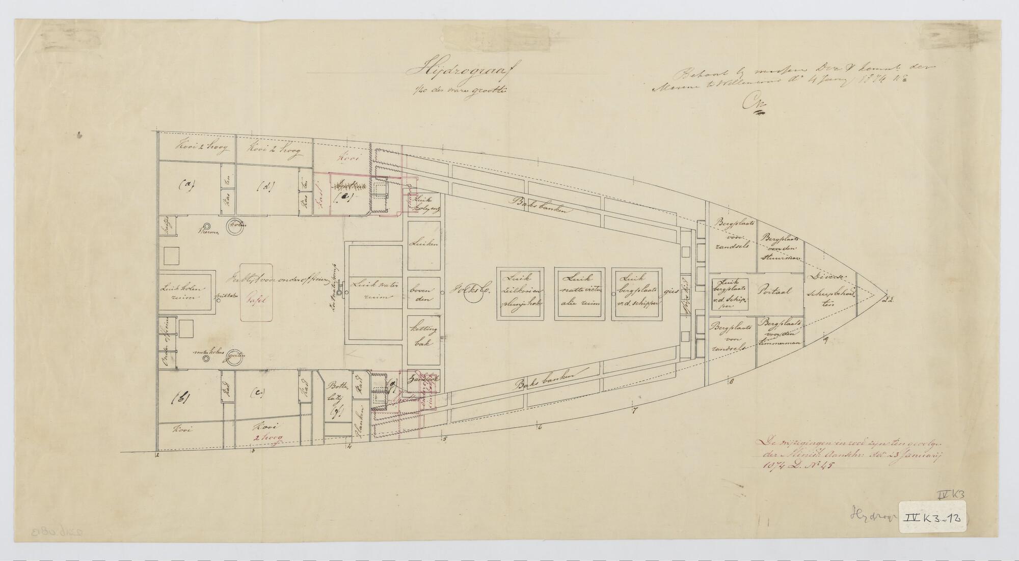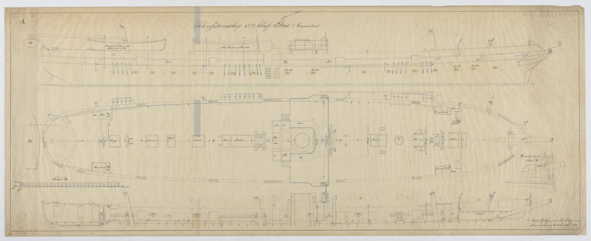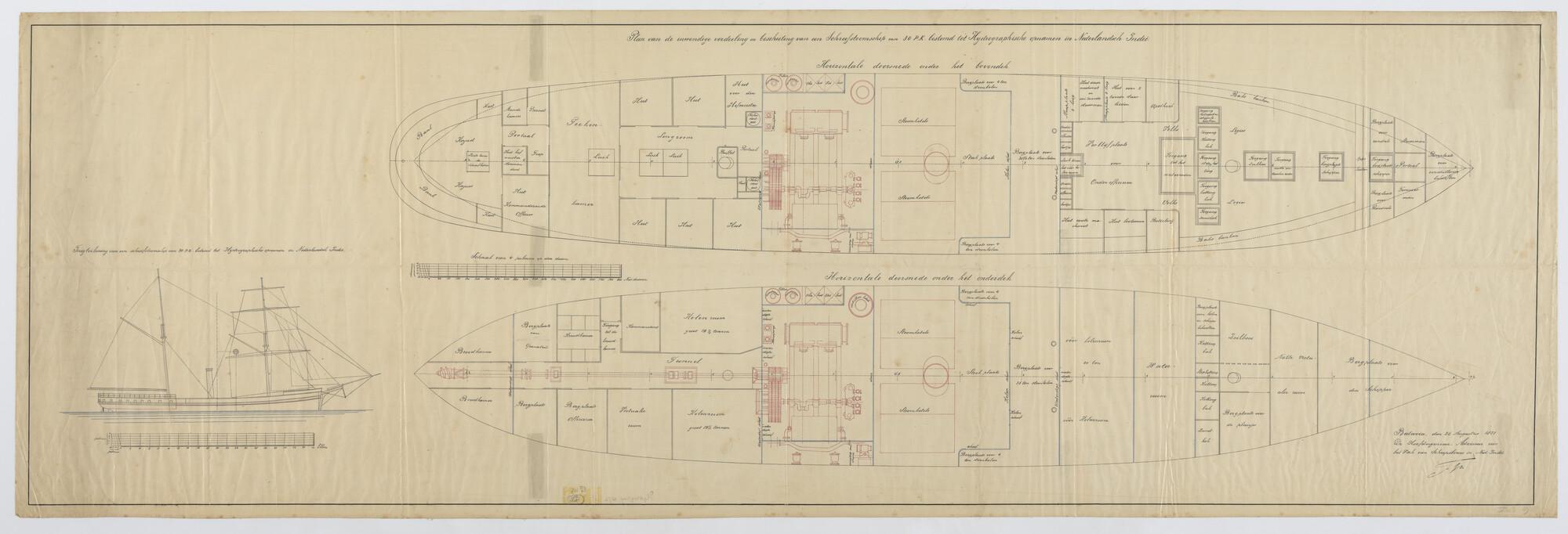 Zr.Ms. Hydrograaf, 1872. Tuigtekening en inwendige v...