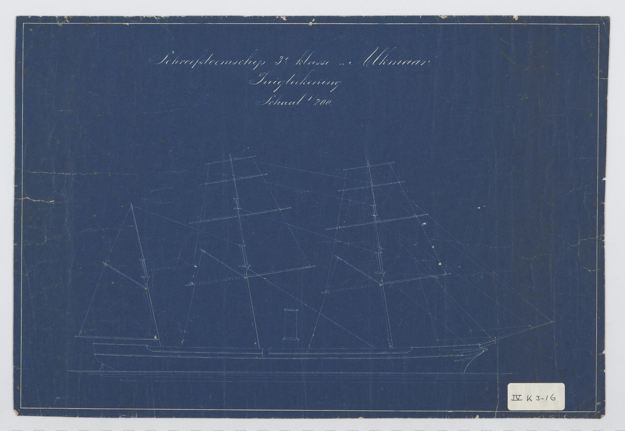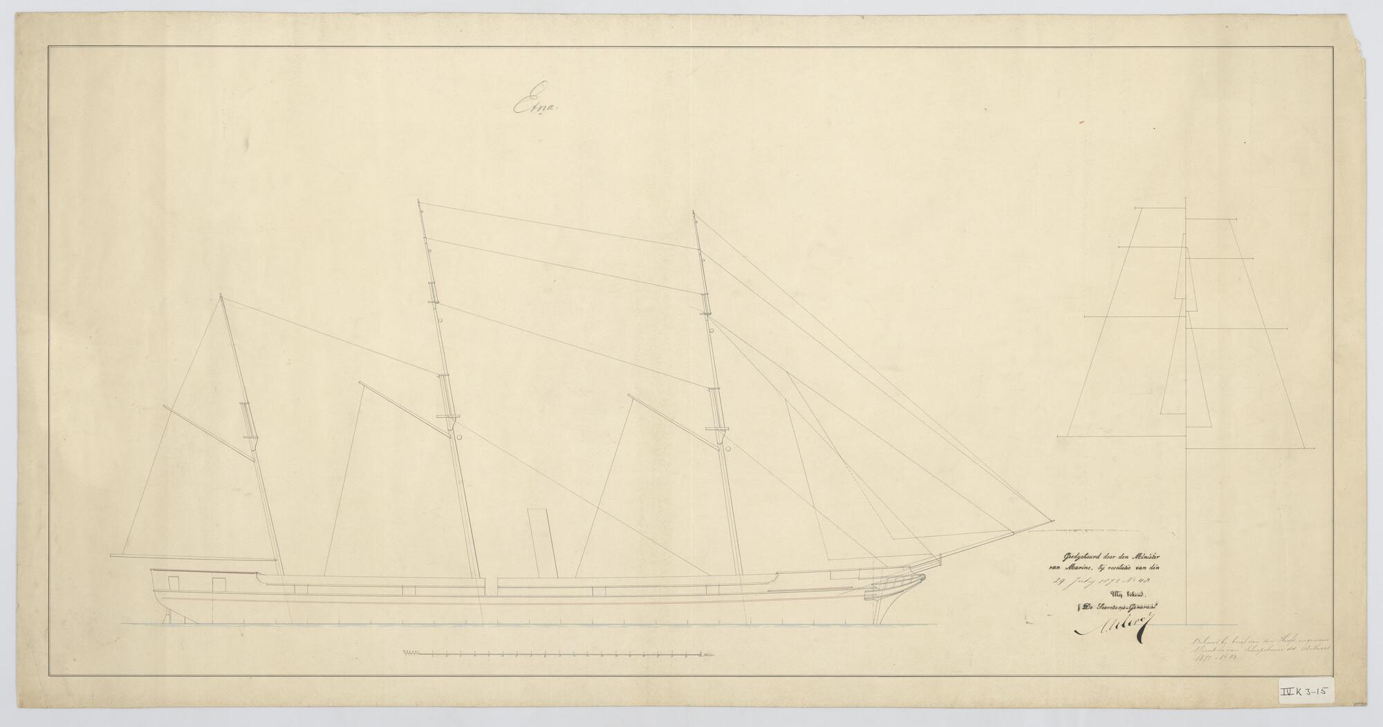 Zijaanzicht met tuigplan van het schroefstoomschip 3...