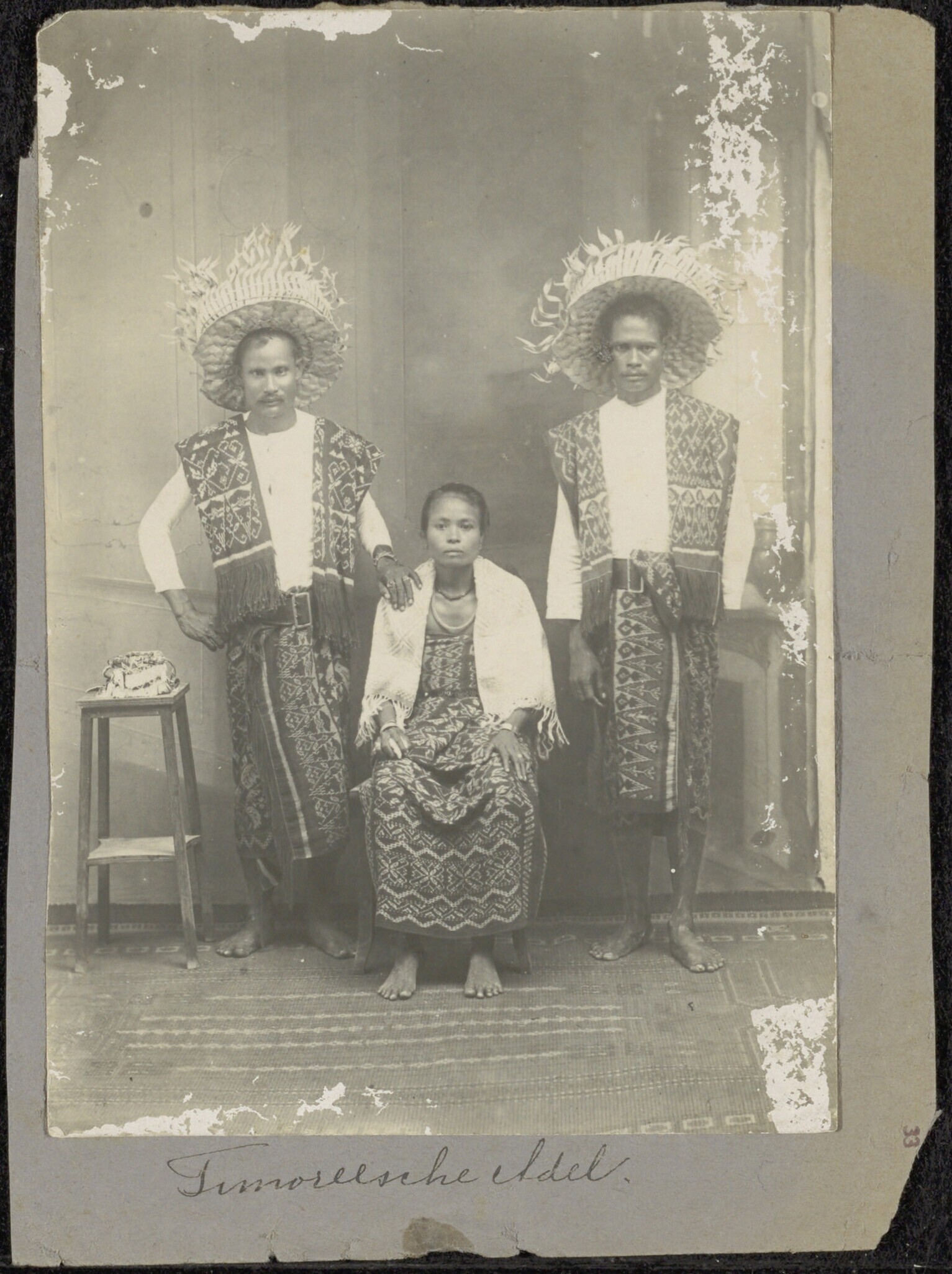 Studioportret van twee Timorese mannen en een vrouw ...