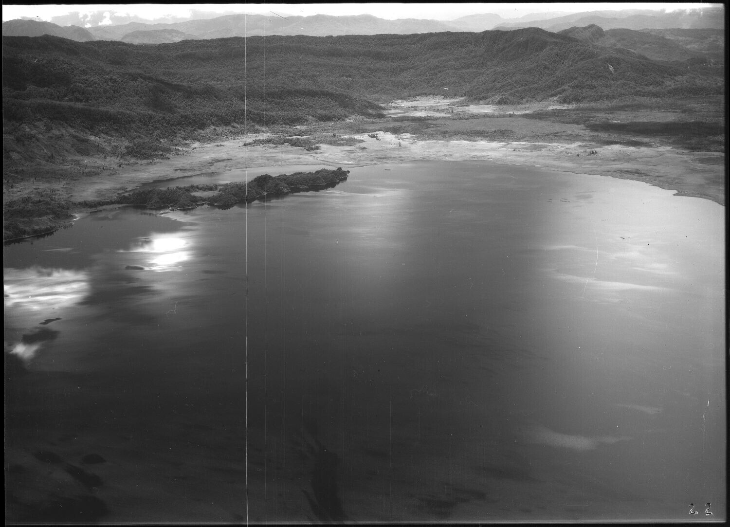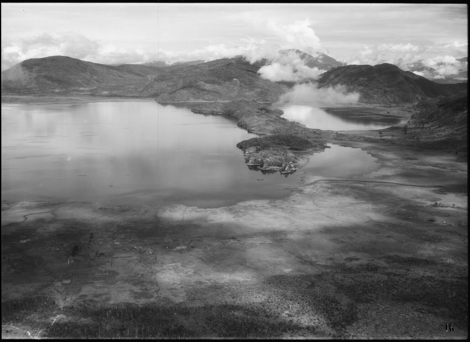 Luchtfoto van berglandschap met het Paniai-meer, een...