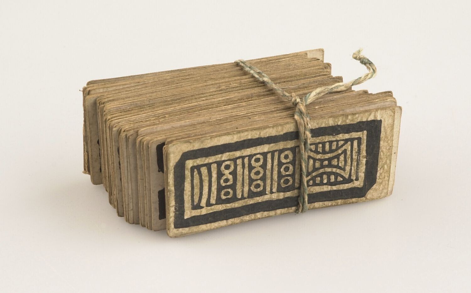 Gevouwen, gedrukt boek met houten schutbladen, in ka...