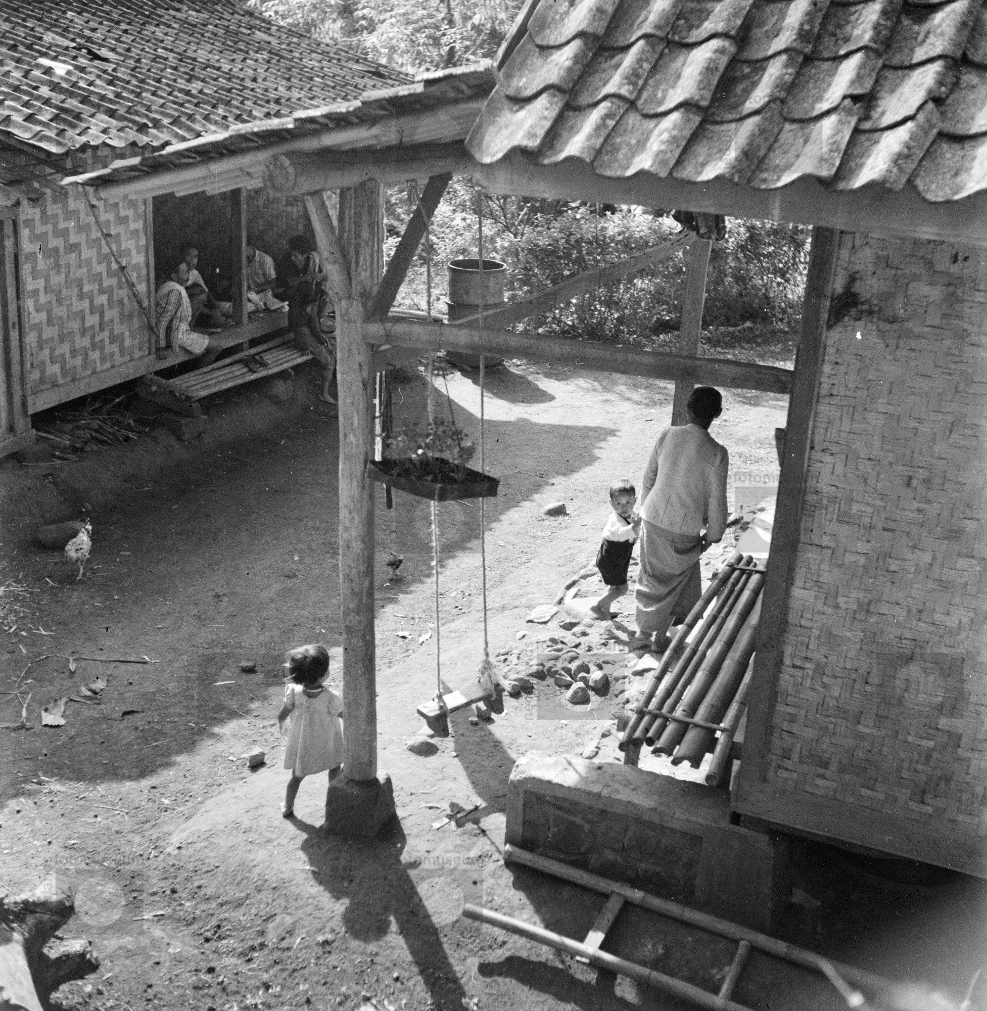 Bewoners tussen hun inheemse woningen in een kampong...