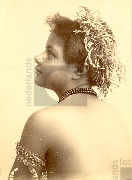 Studioportret en profil naar links van jonge vrouw v...