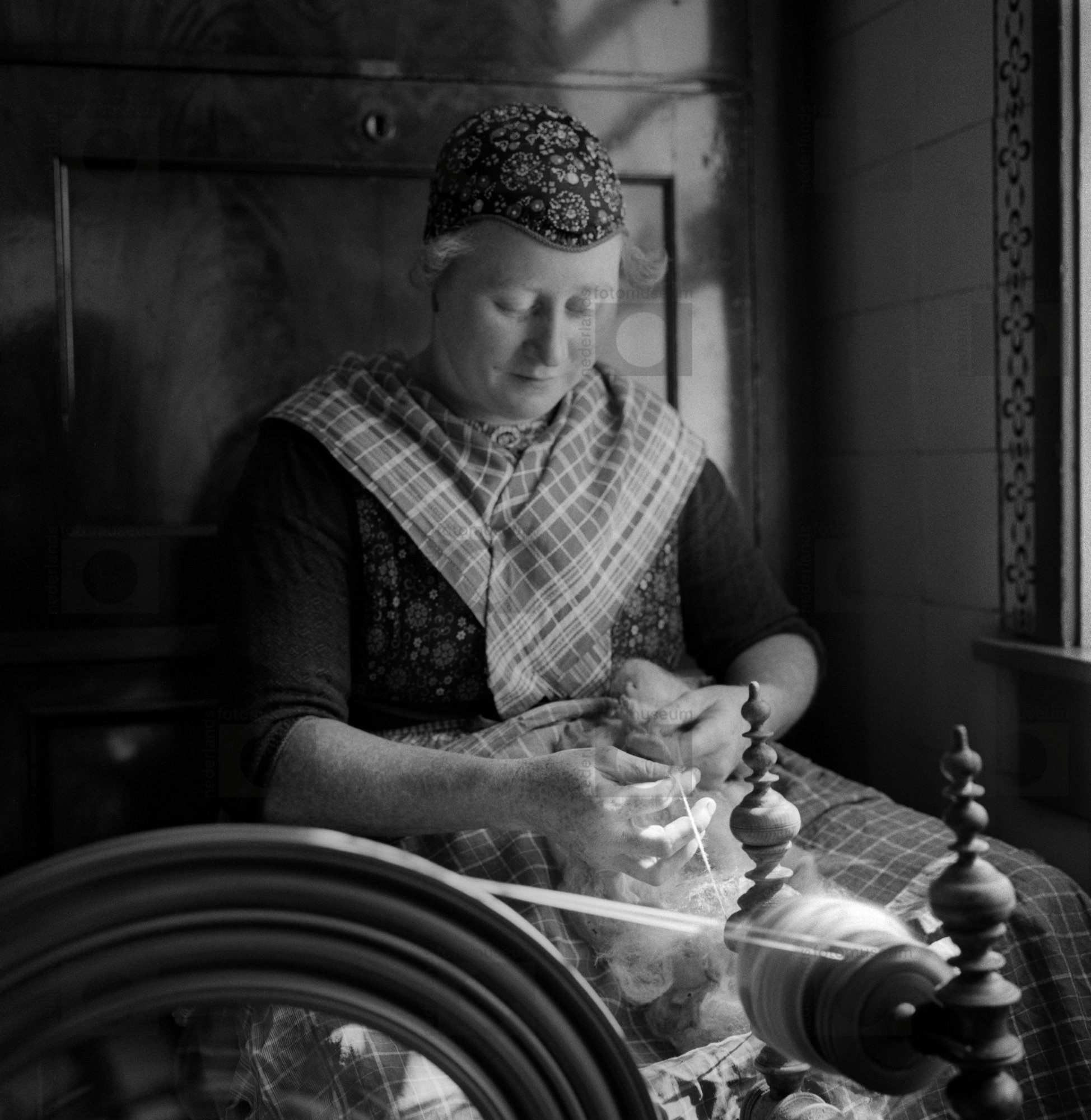 Vrouw in huiselijke klederdracht werkt aan het spinn...