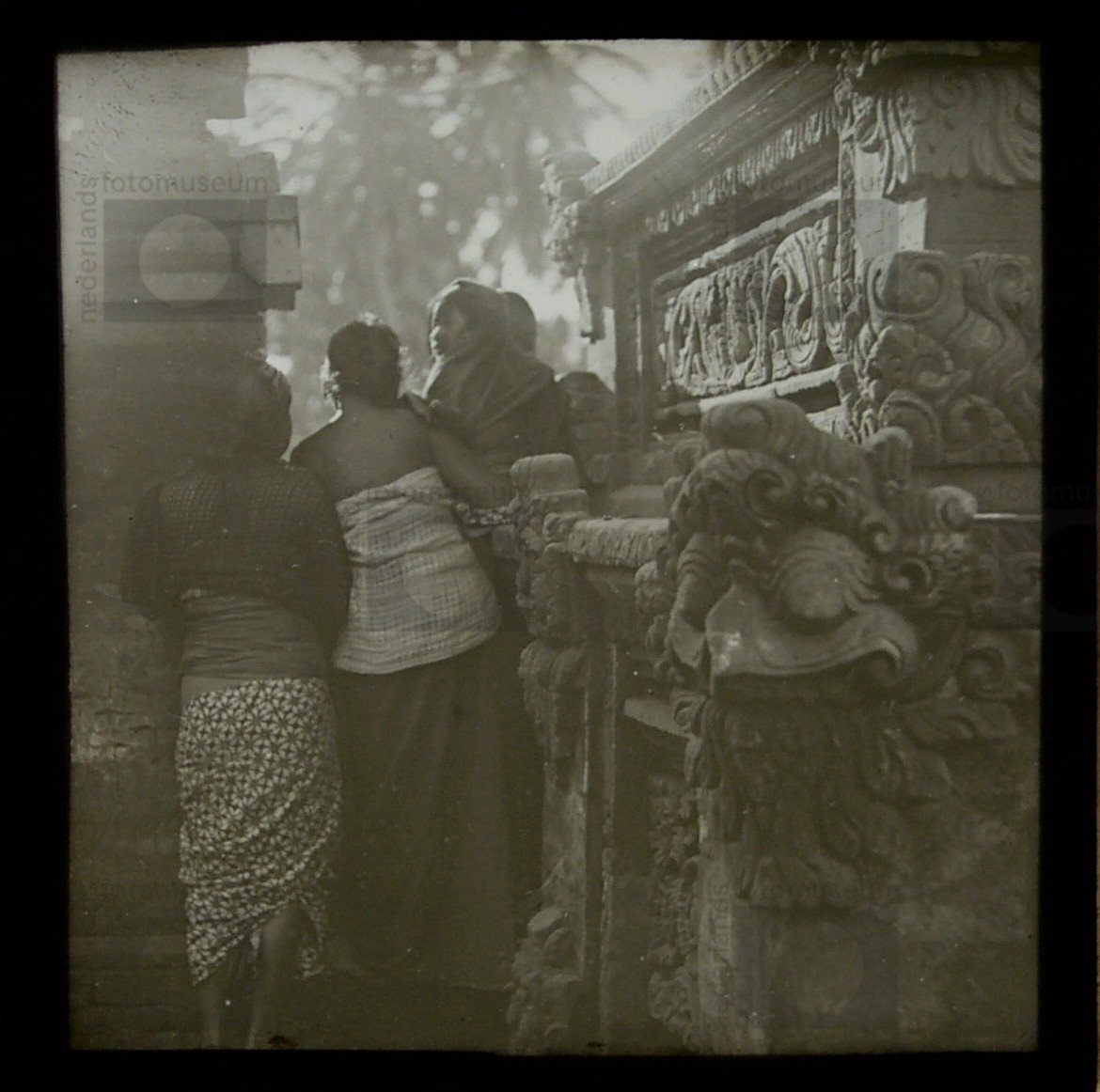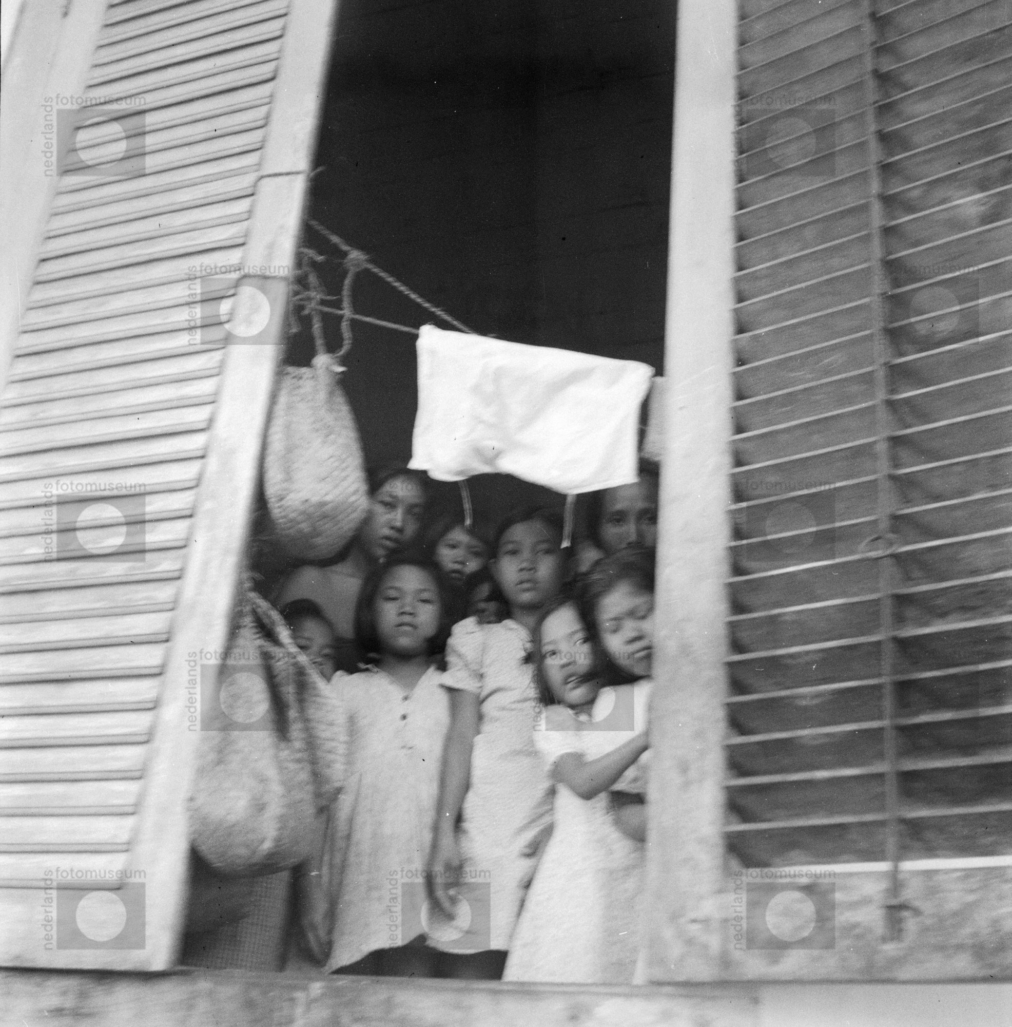 Een groep vrouwen en kinderen kijkt tussen raamluike...