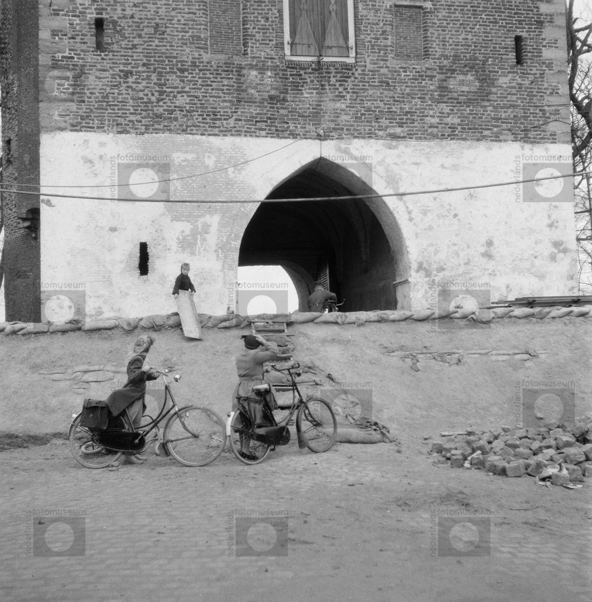 Bewoners in deuropening van huis, Watersnoodramp, He...
