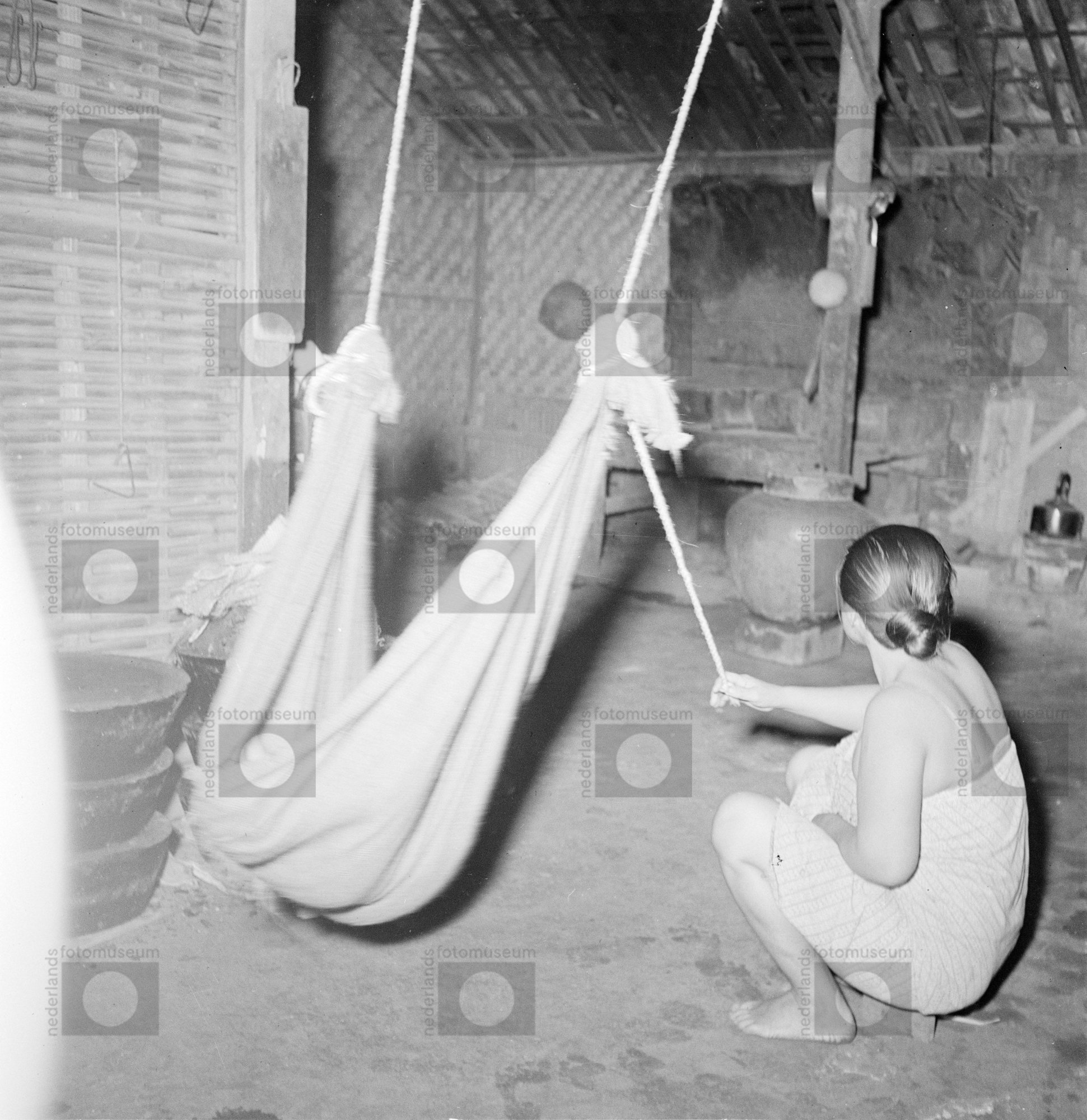 Vrouw wiegt kind in hangmat in haar huis, Indonesië ...