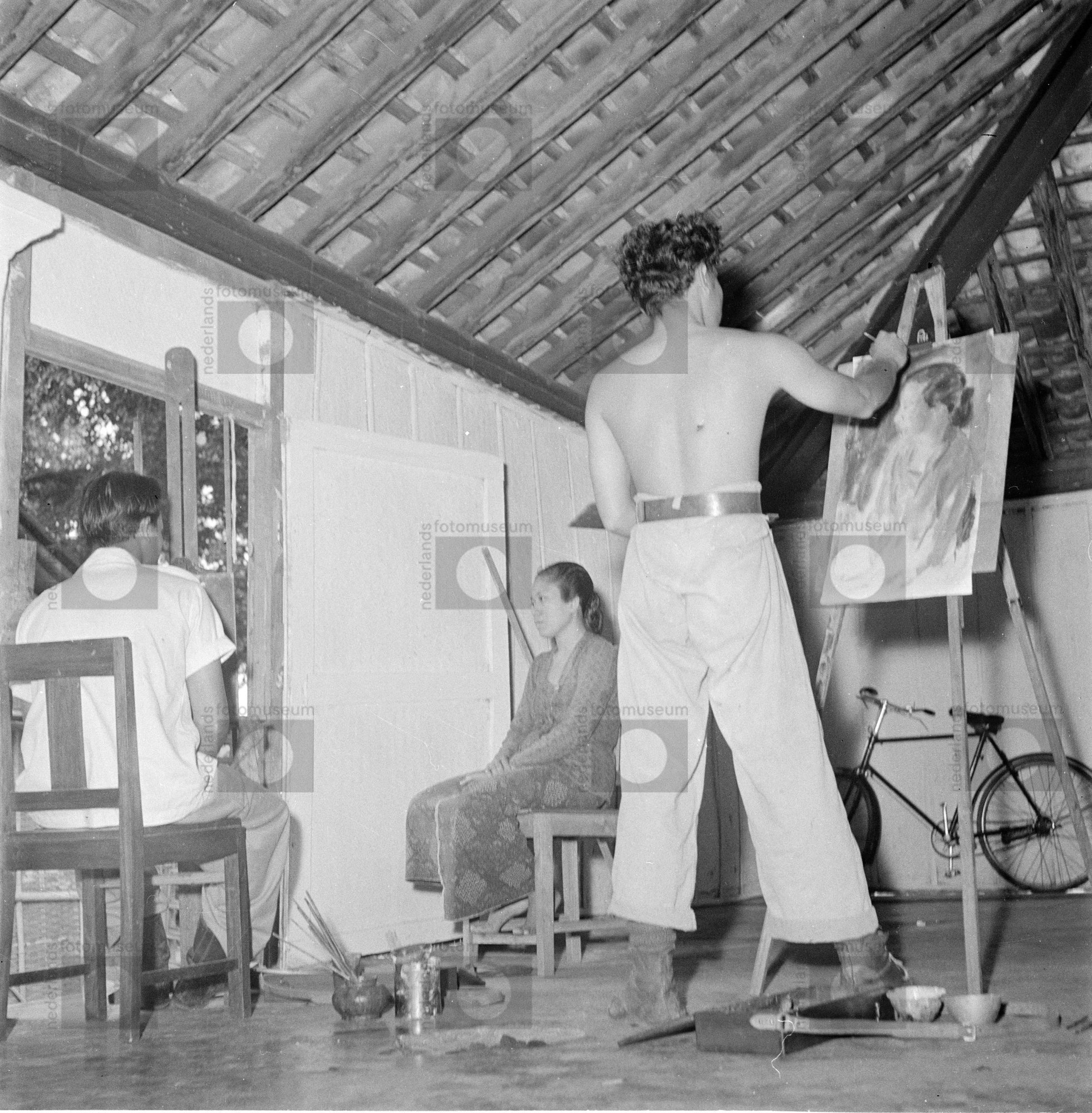Een portretschilder in zijn atelier aan het werk, In...