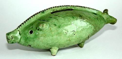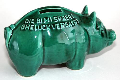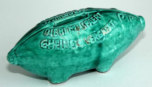 Spaarvarken. Licht groen varken met drie poten. Ker...