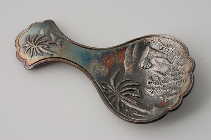 Metalen theeschep van Van Nelle (?) met theeplantage