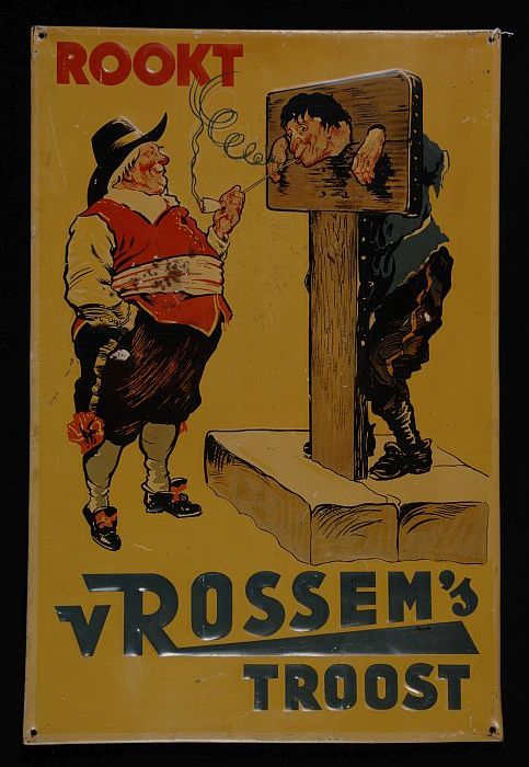Reclamebord met man aan schandpaal met "rookt v. Ros...