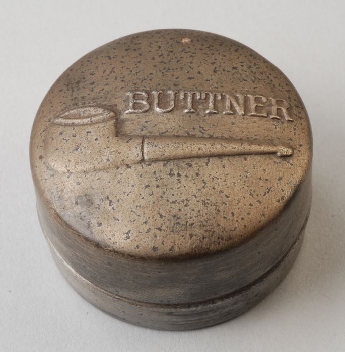 Rond metalen doosje met afbeelding pijp en "BUTTNER"