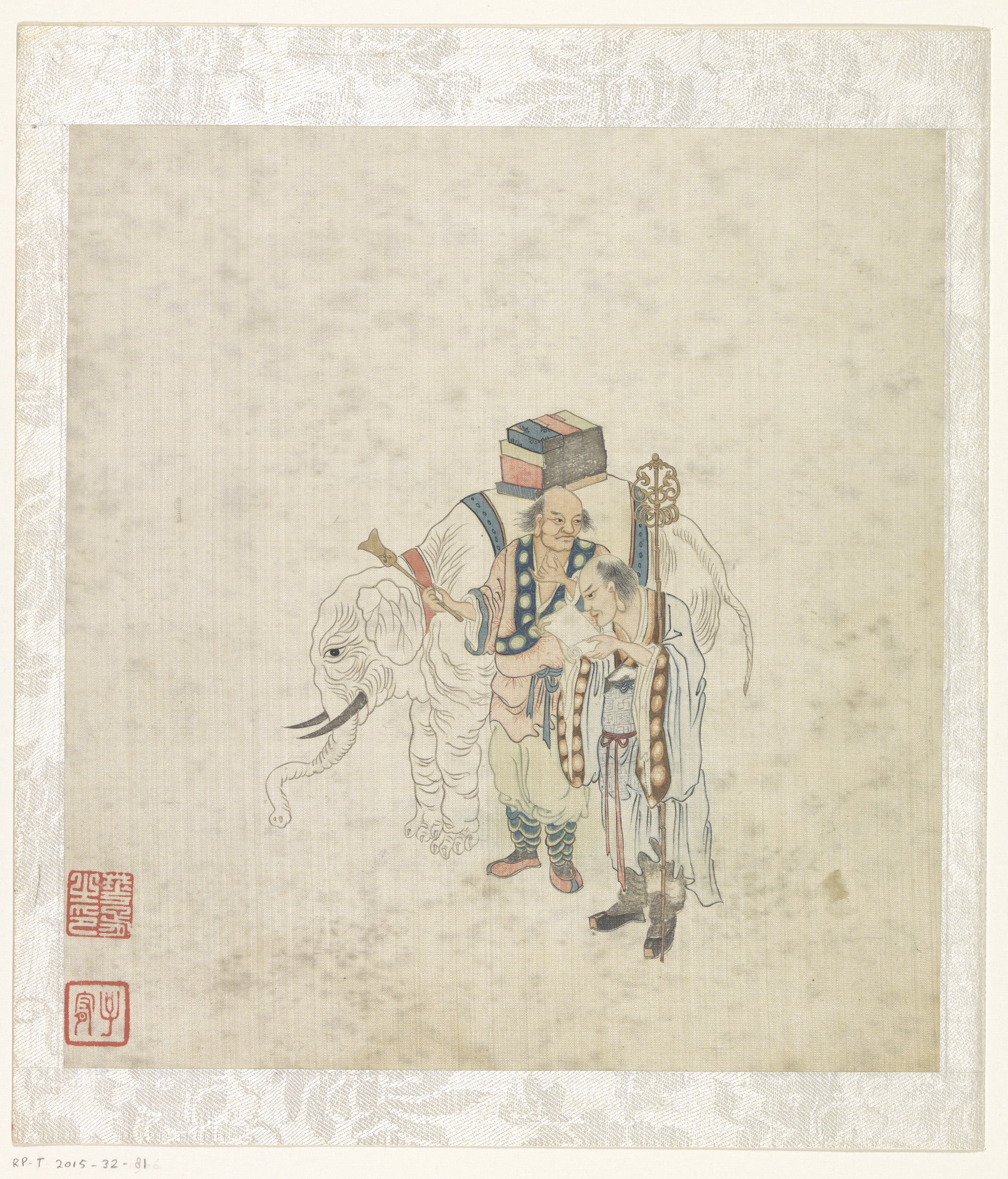 Twee mannen naast een olifant met een stapel boeken ...