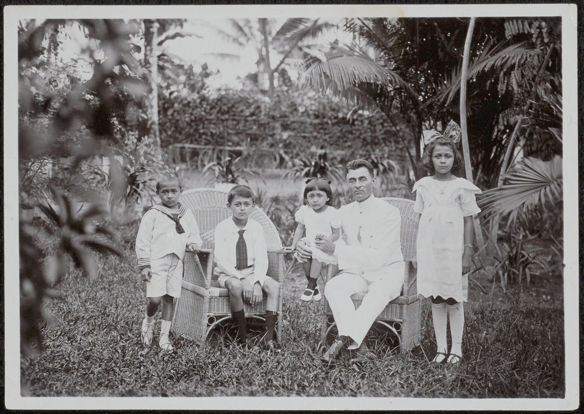 Familieportret van vader met kinderen in de tuin