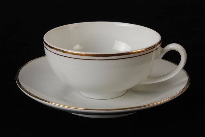 Theekop (A) en schotel (B) van Van Nelle met goudkle...