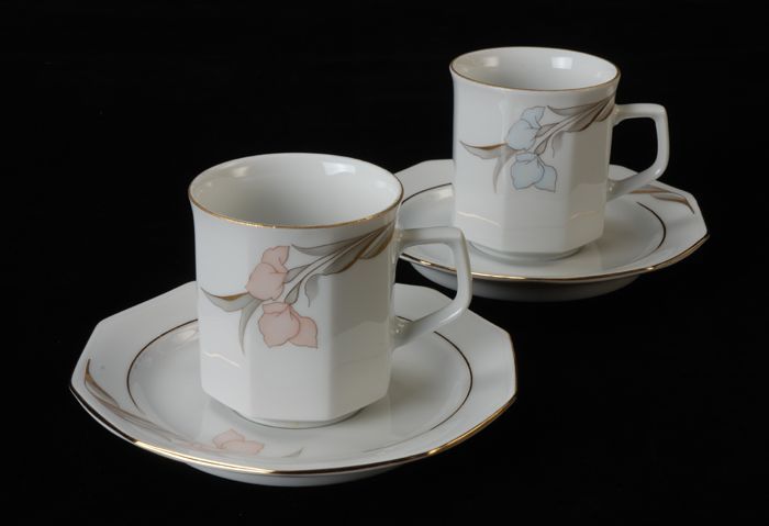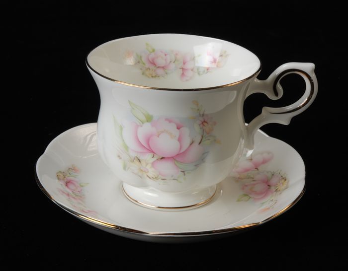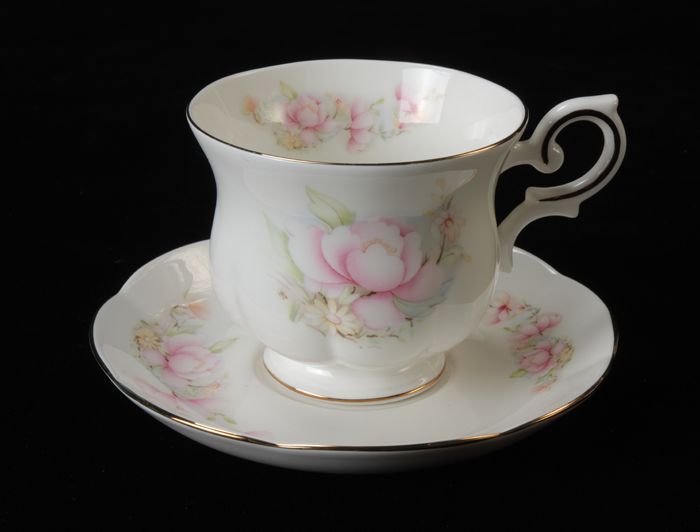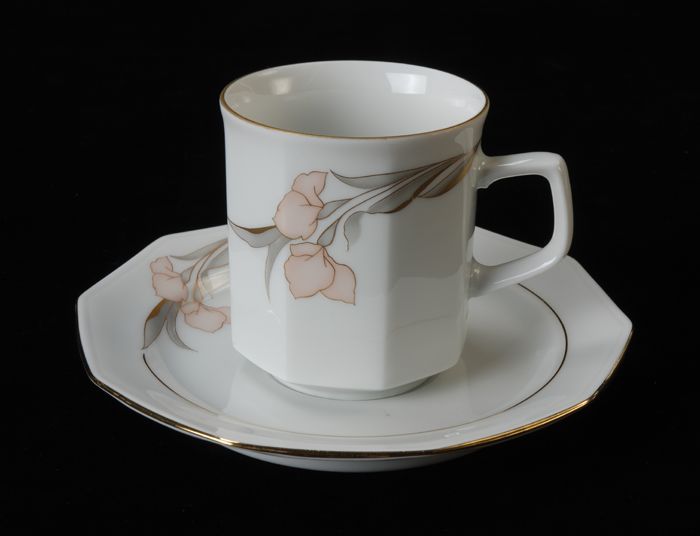 Kop (A) en schotel (B) van Van Nelle met roze bloeme...