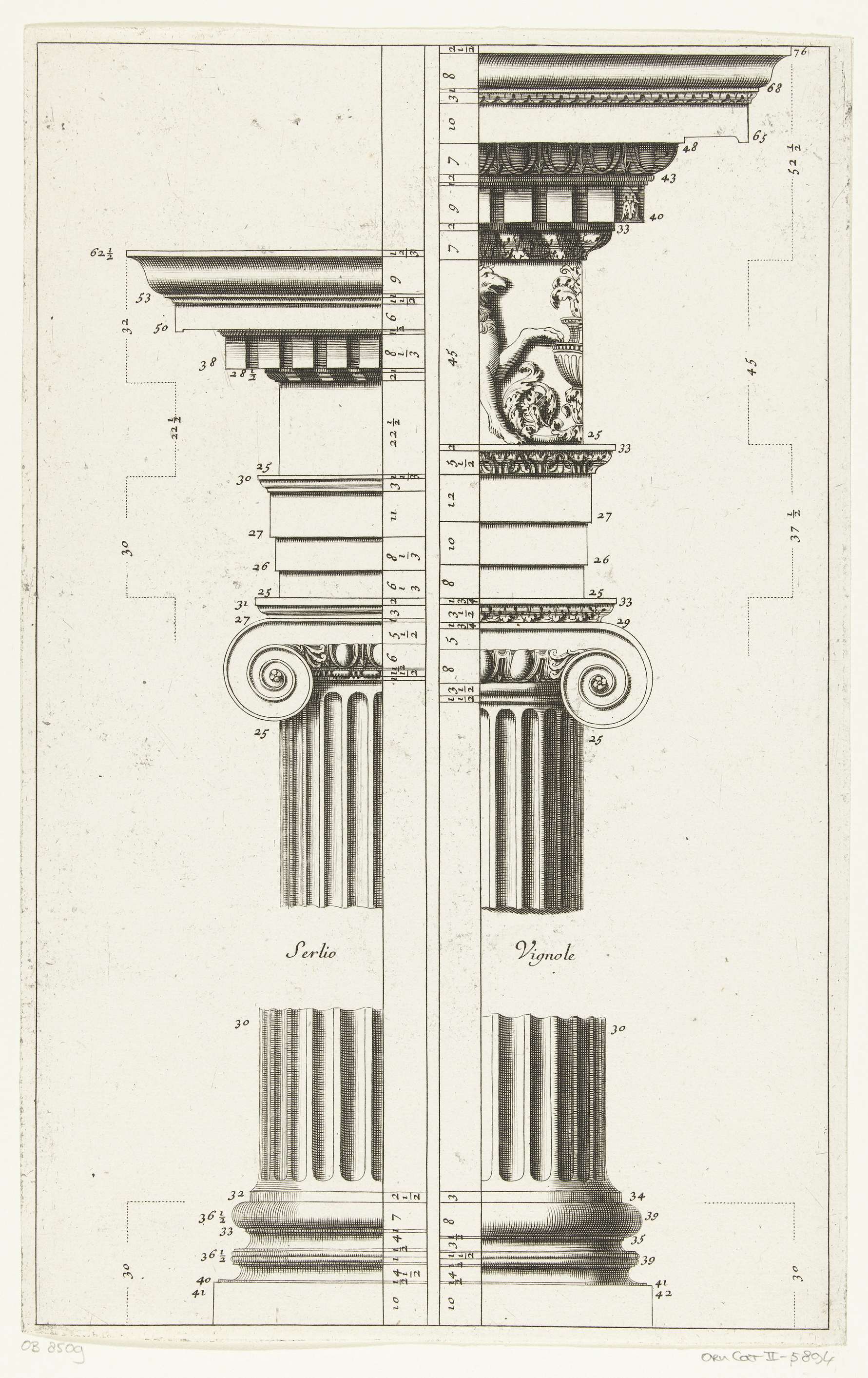 Ionische orde, deel van zuil met voetstuk en hoofdge...