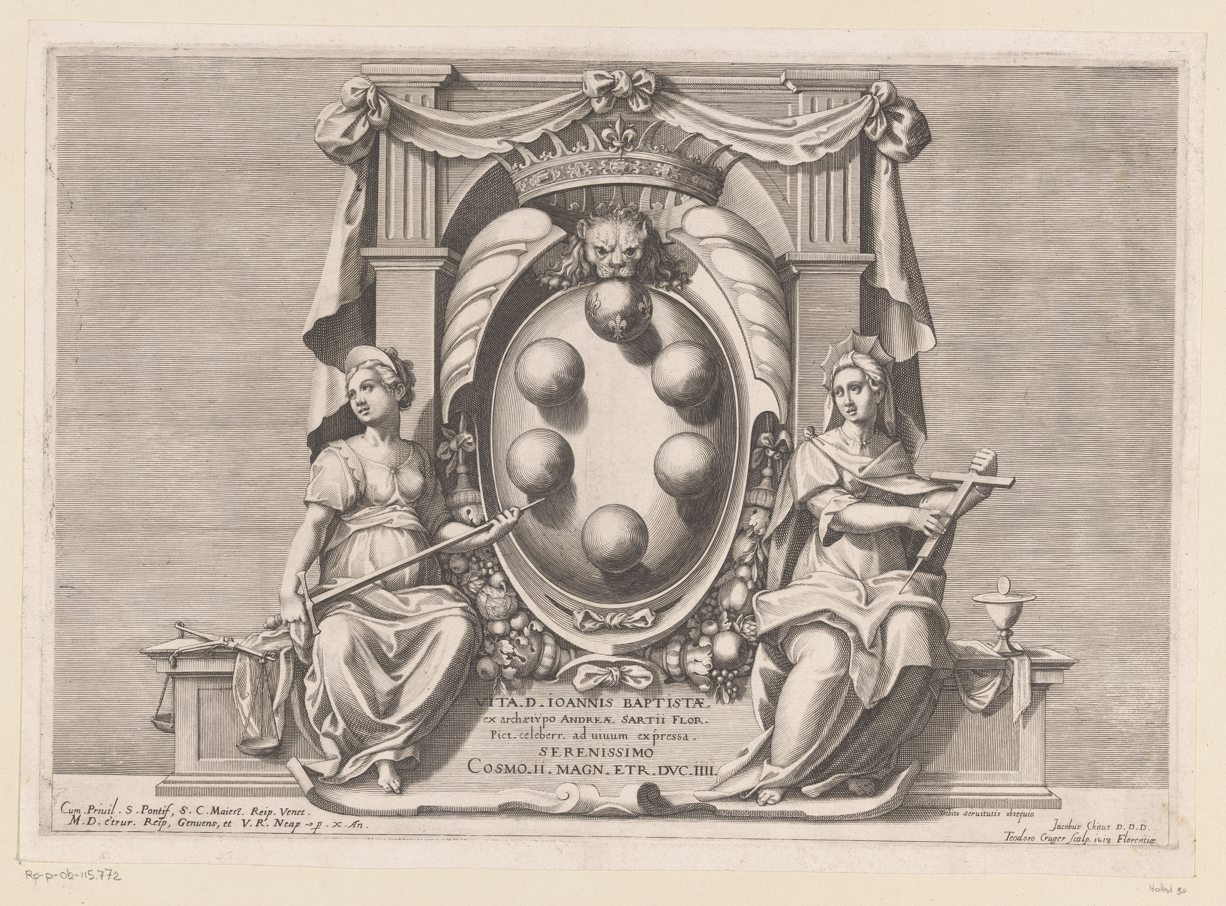 Familiewapen van de Medici in gedecoreerde lijst ver...