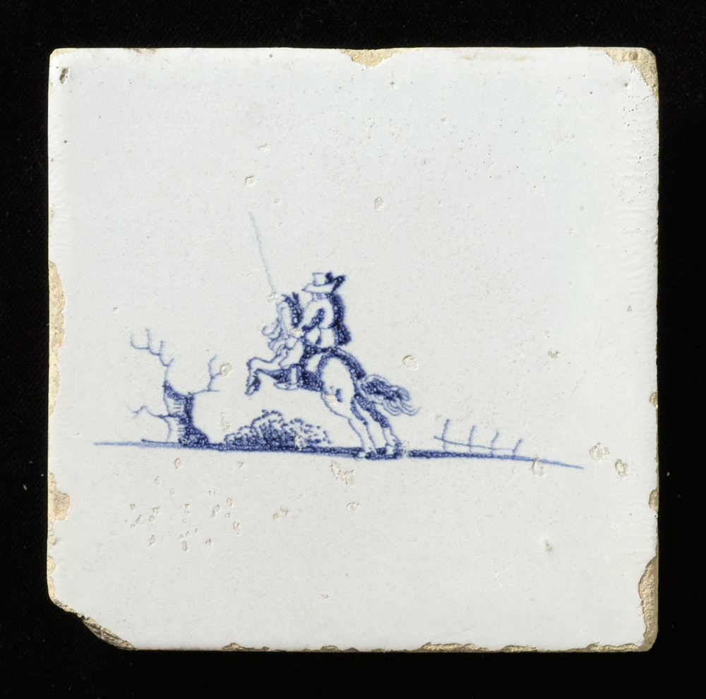 Tegel in tinglazuur, voorstellende ruiter in landsch...