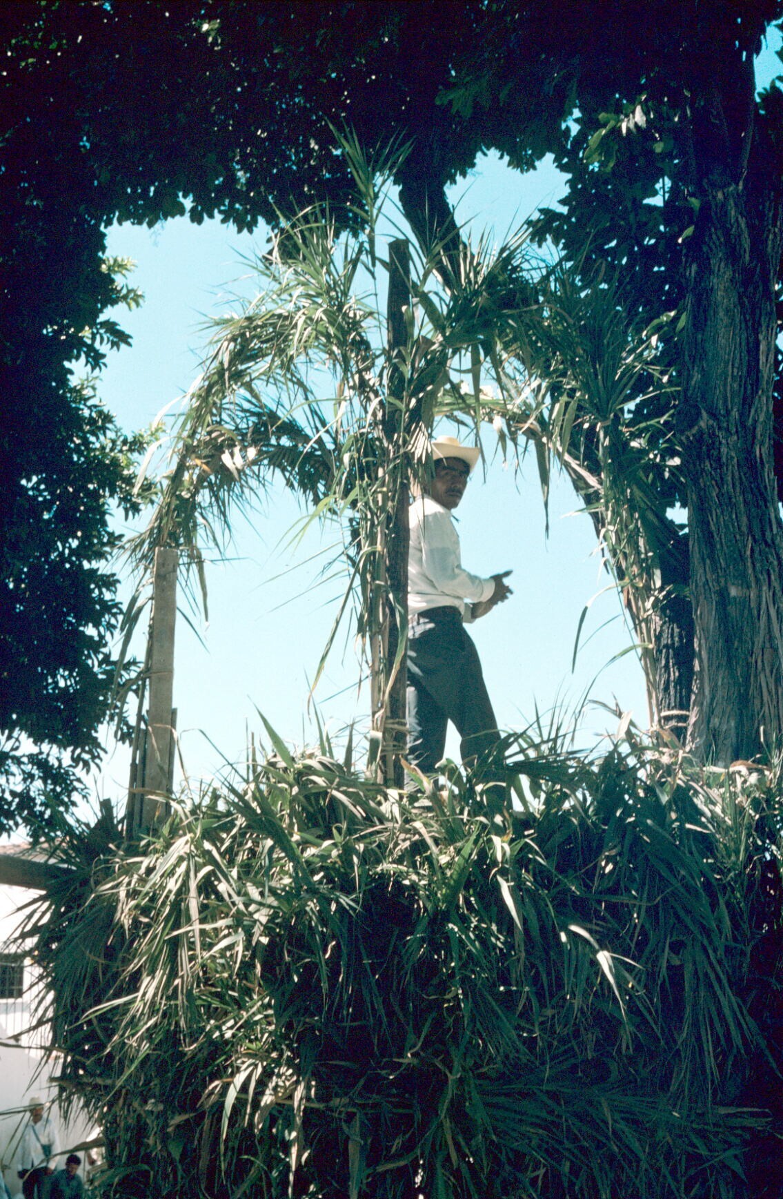 man op bamboehut